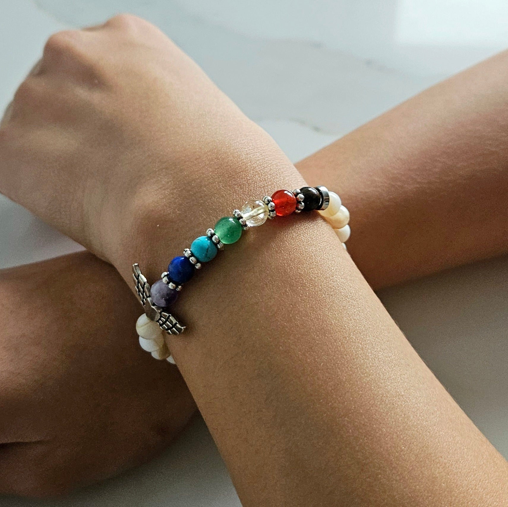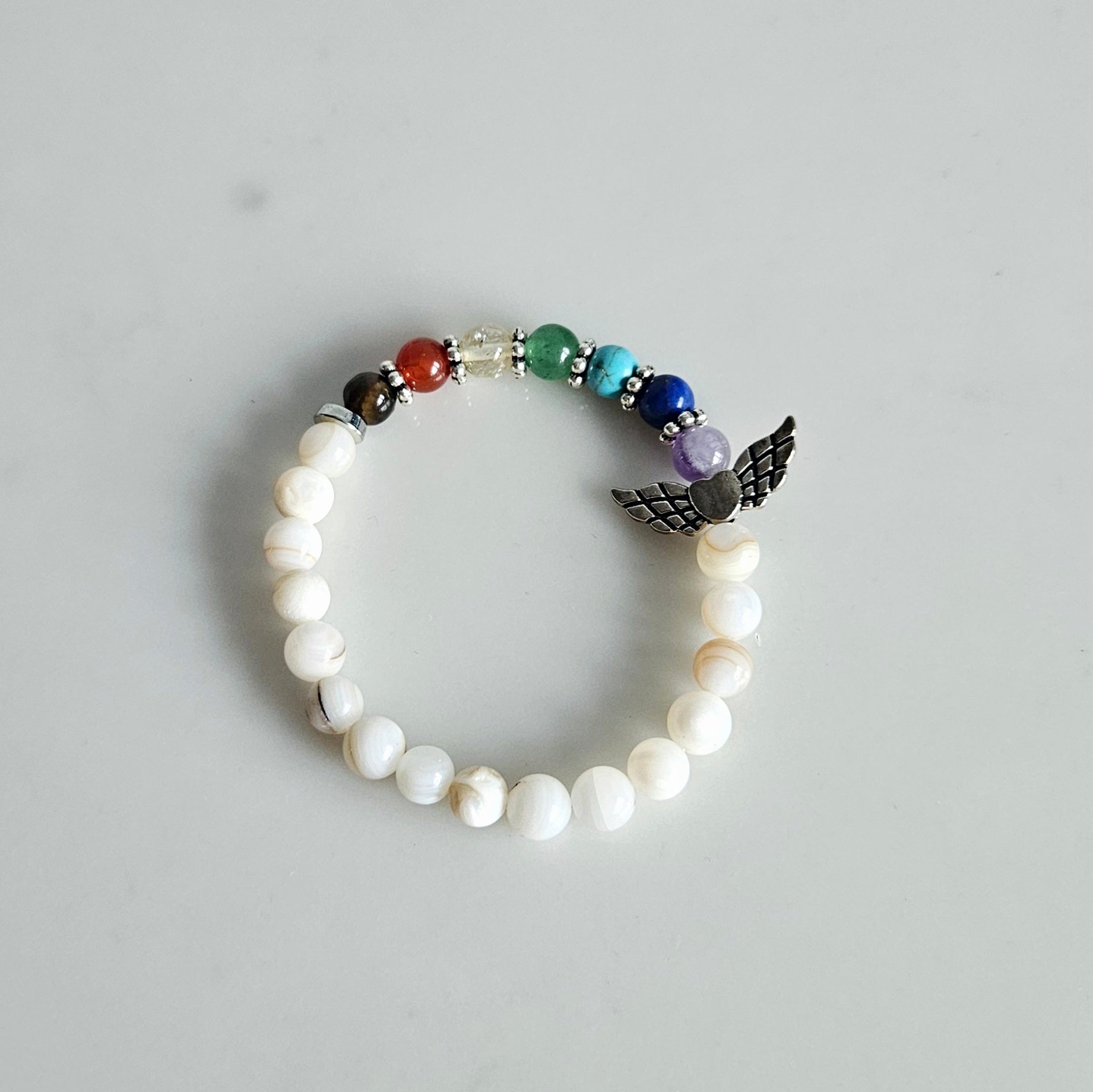 Ce bracelet pour enfant combine des perles de nacre blanche et des perles aux couleurs des chakras. Il est orné d'un charmant pendentif en forme d'ailes, symbolisant la légèreté et l'harmonie.