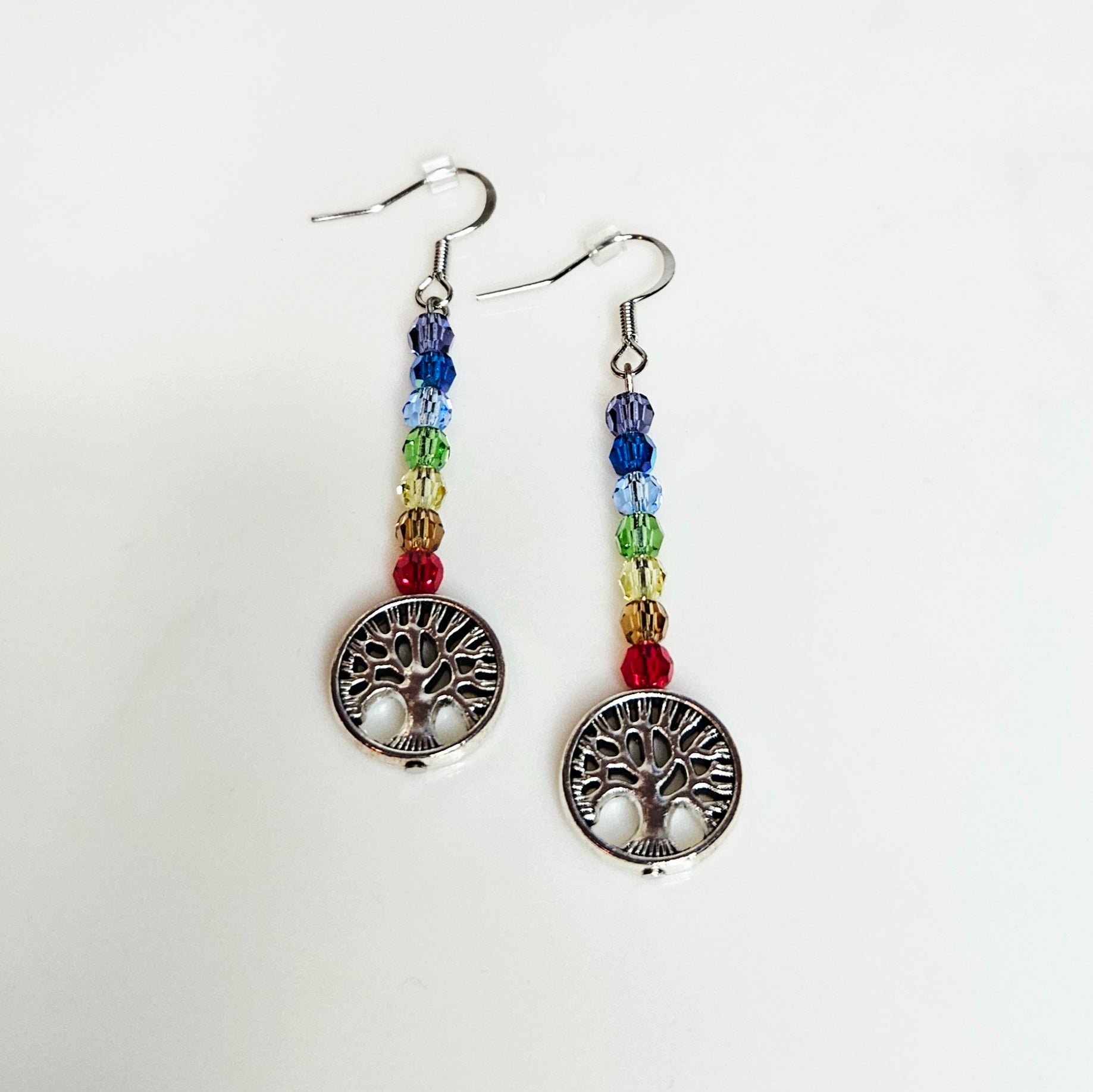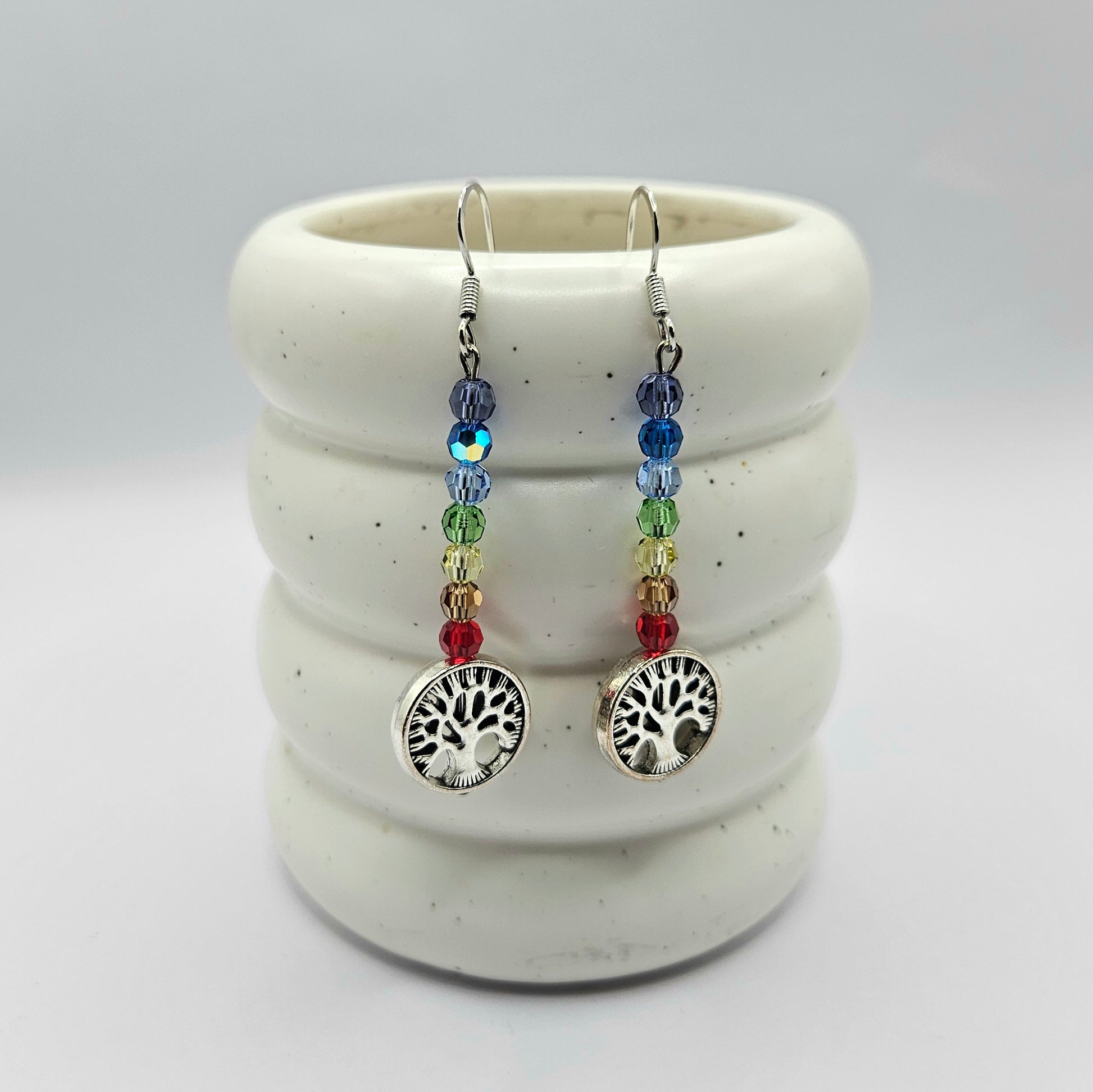 Élégantes boucles d’oreilles ornées de cristaux aux couleurs des 7 chakras et d’un pendentif Arbre de Vie en acier inoxydable.