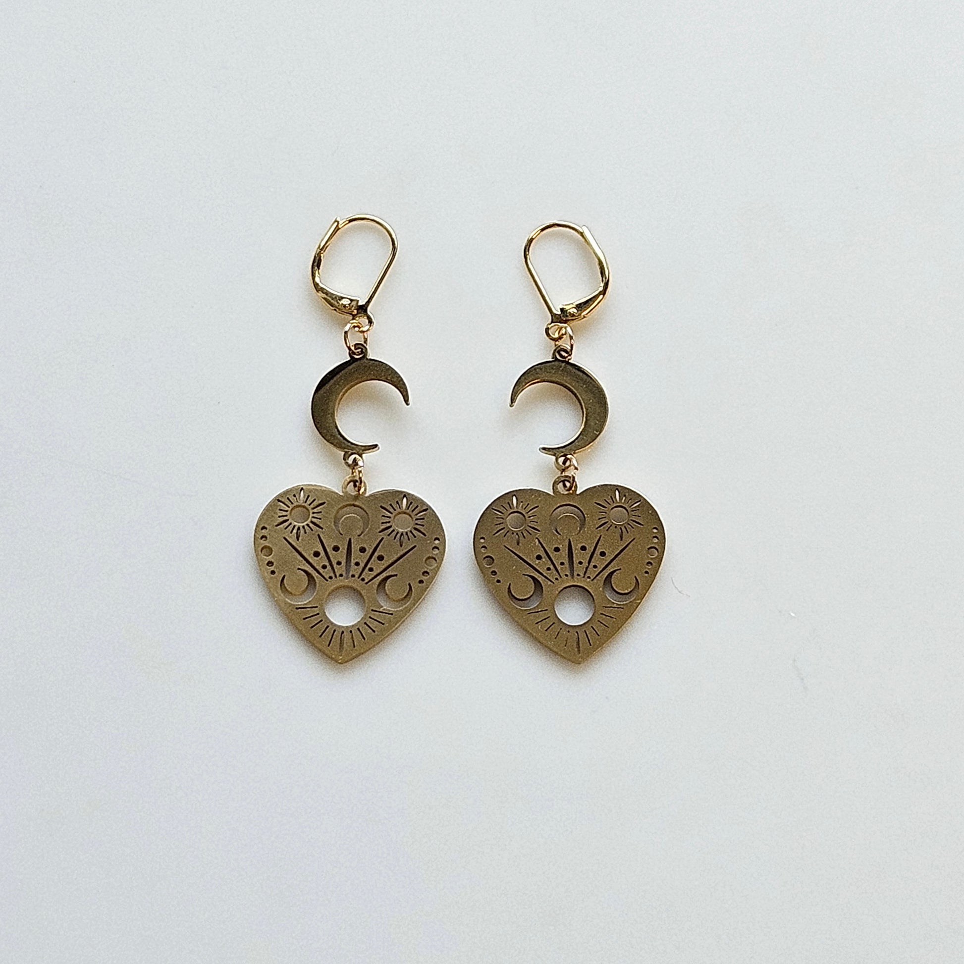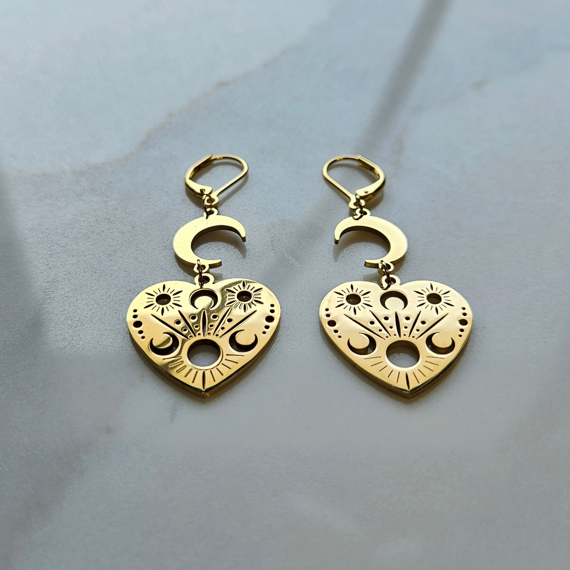 Ajoutez une touche de magie céleste à votre style avec ces superbes boucles d'oreilles en acier inoxydable doré. Elles présentent un pendentif cœur orné de motifs de soleil, lune et étoiles, suspendu à un élégant croissant de lune.