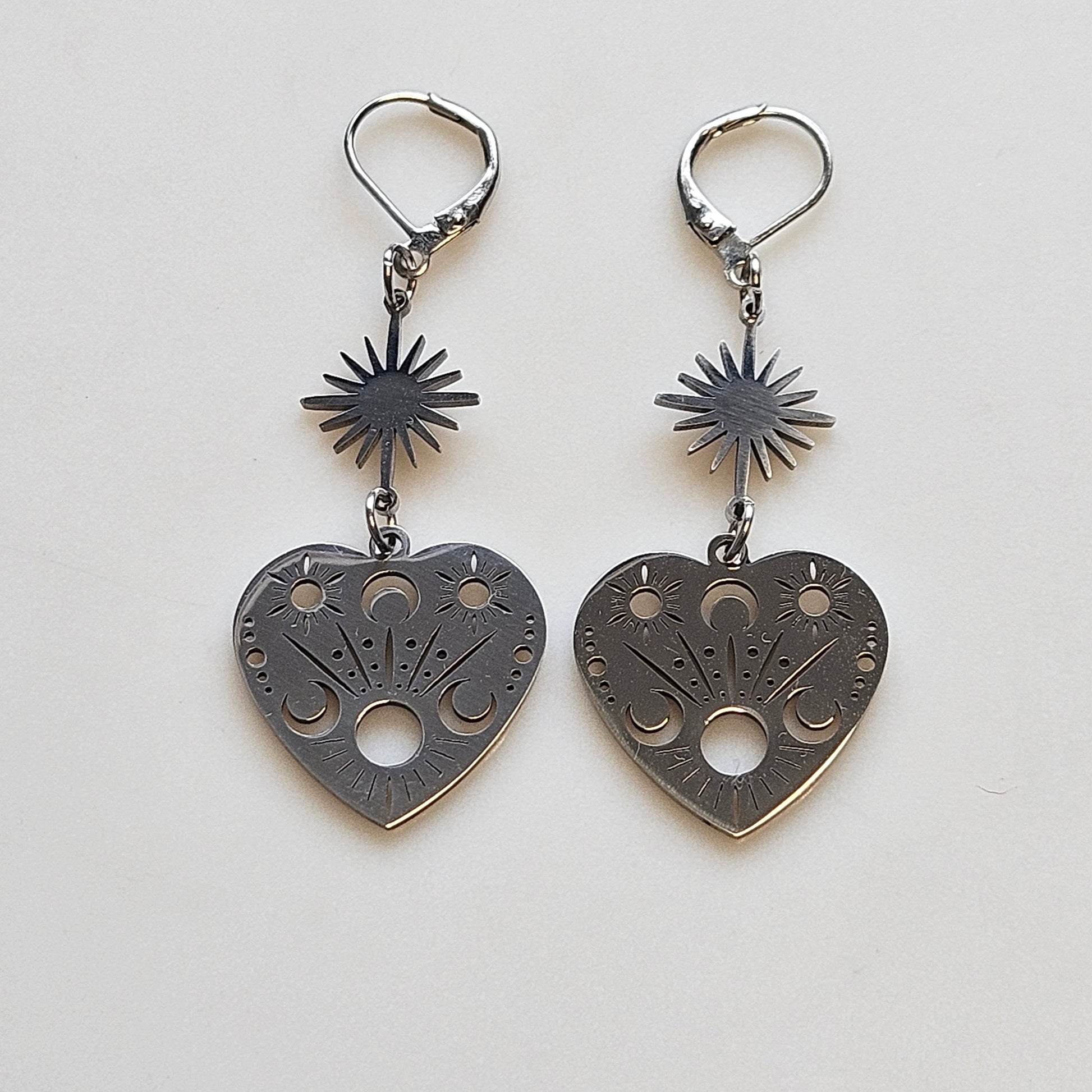 Sublimes boucles d'oreilles en acier inoxydable argenté avec un cœur céleste (soleil, lune, étoiles) et un croissant de lune. Hypoallergéniques et résistantes au ternissement. Ajoutez une touche de mystère et d'éclat à votre look.