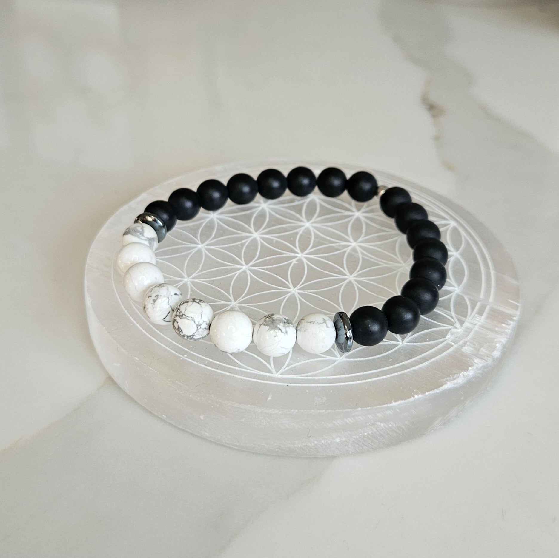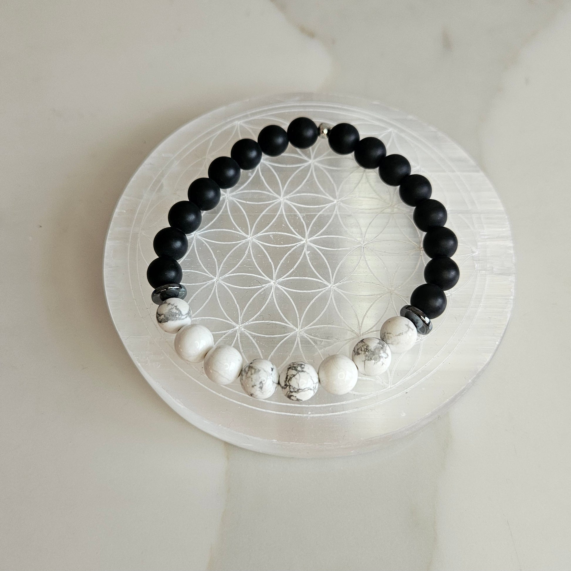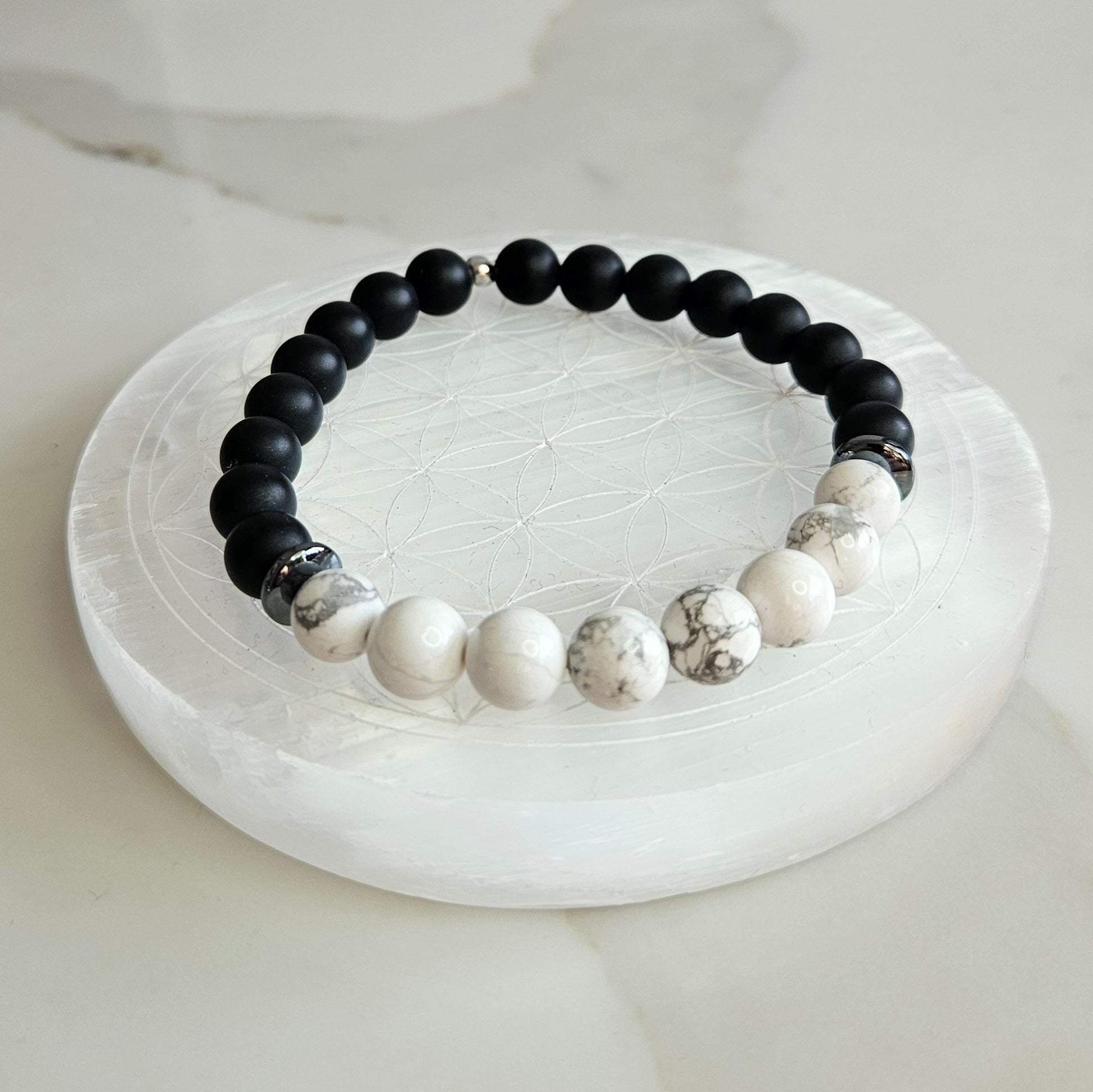 Bracelet associant la protection de l'onyx, la sérénité de l'howlite et l'équilibre de l'hématite.