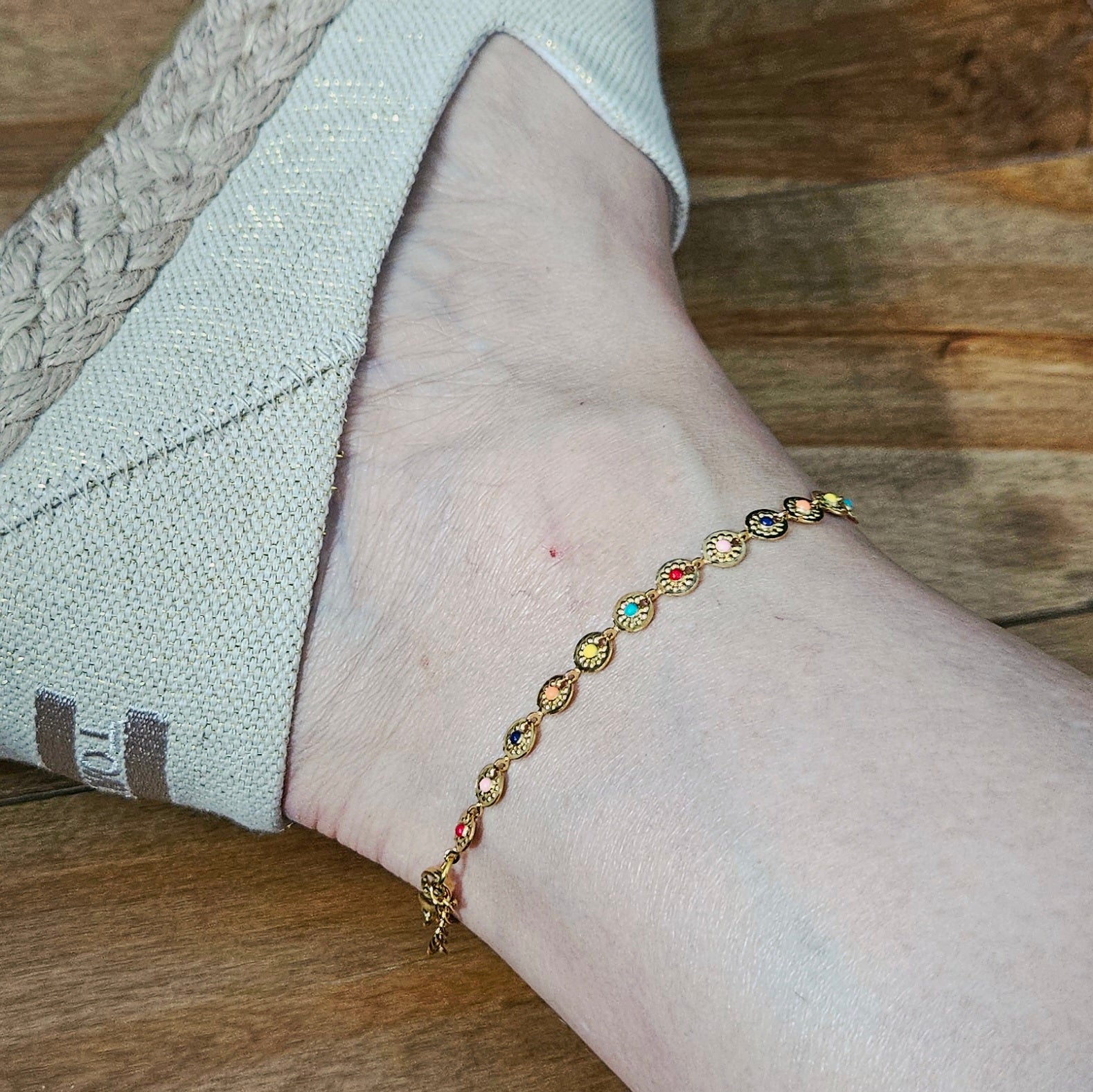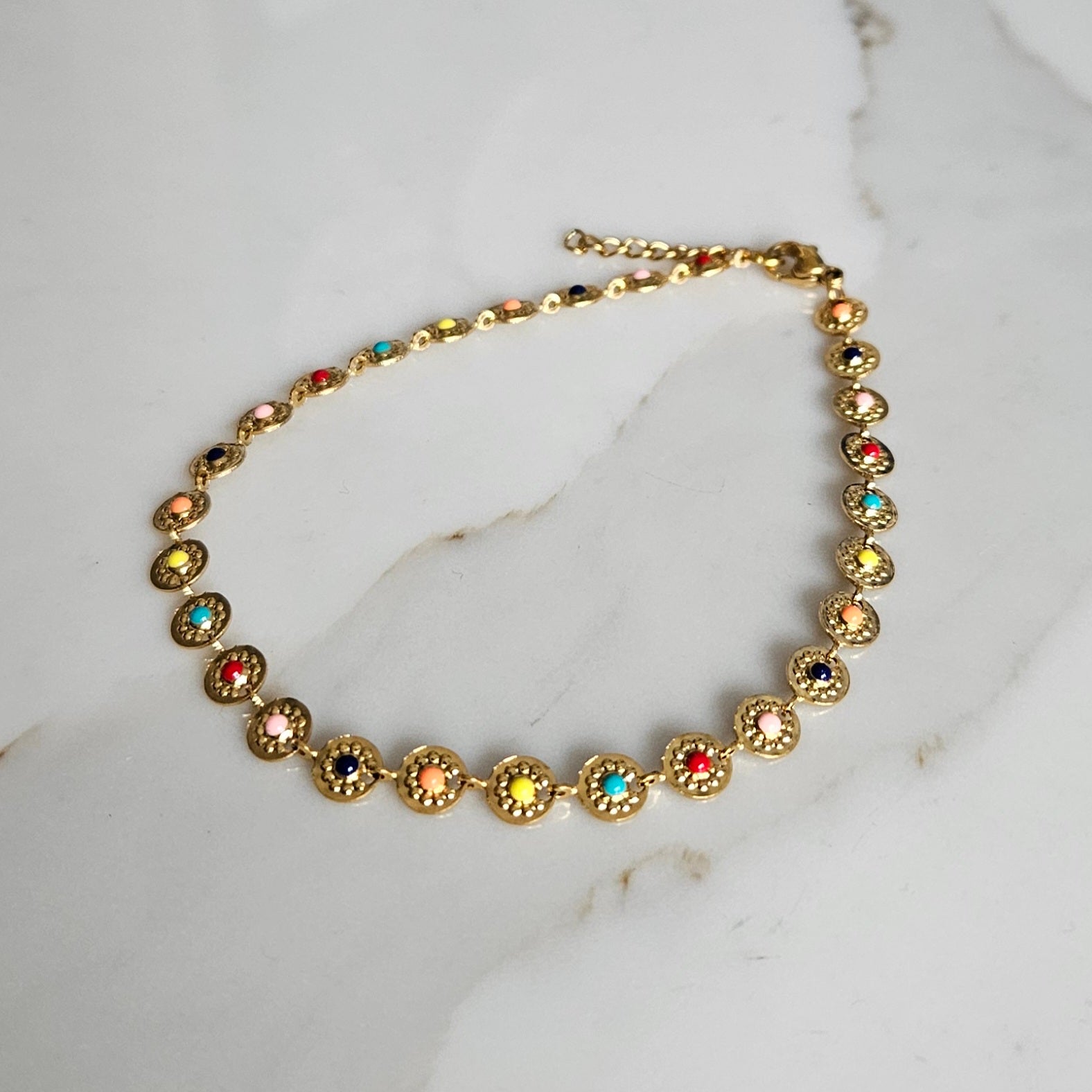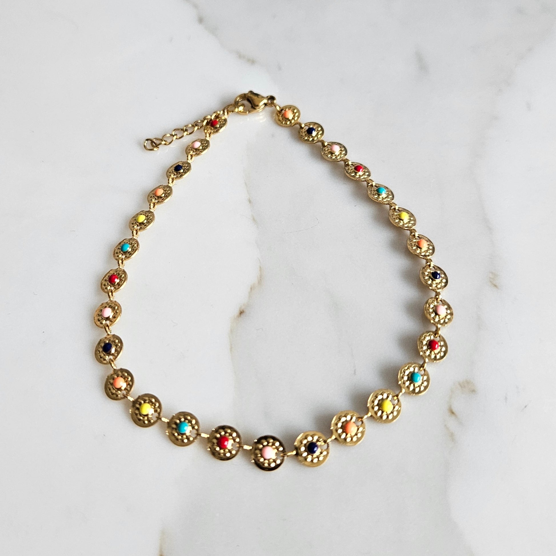 L'accessoire parfait pour les journées ensoleillées ! Cette chaîne de cheville en acier inoxydable est ornée de petites pastilles colorées pour un look joyeux et estival.