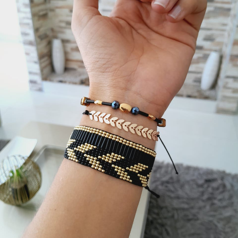 Découvrez nos bracelets ajustables, chacun une pièce unique. Tissés main avec fines perles et dotés d'un pendentif laiton doré ajouré. Style unique assuré !