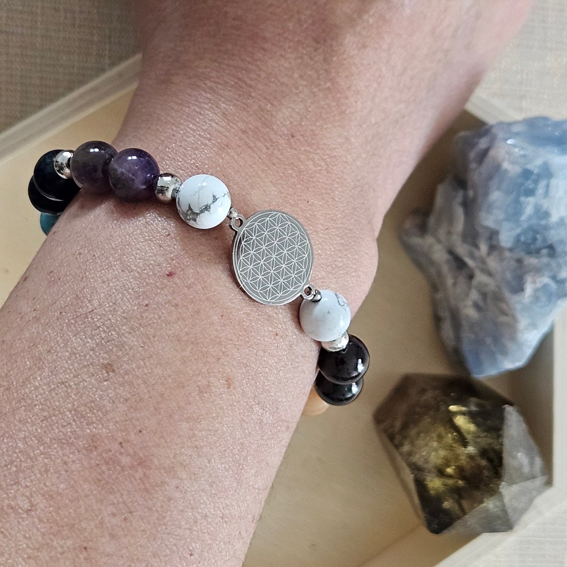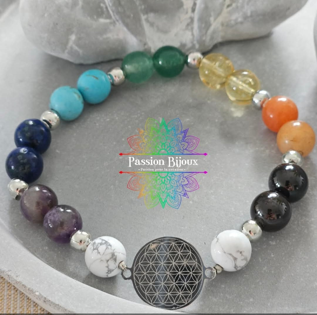 Plongez dans l'harmonie avec ce bracelet qui allie la sérénité des perles blanches marbrées (type howlite) aux couleurs vibrantes des 7 pierres des chakras. Une magnifique breloque Fleur de Vie en acier inoxydable vient compléter ce bijou, symbolisant la création, l'harmonie universelle et l'équilibre.