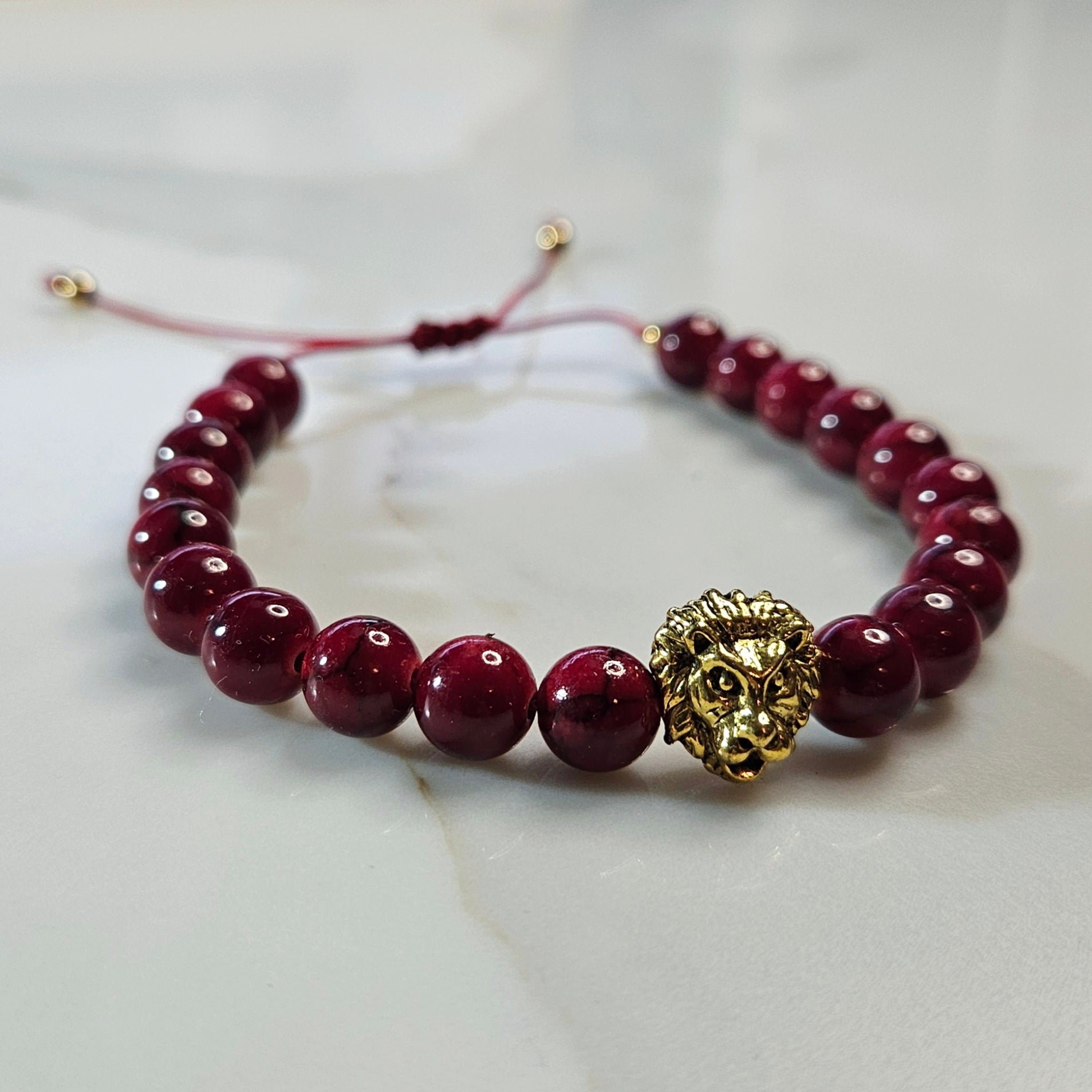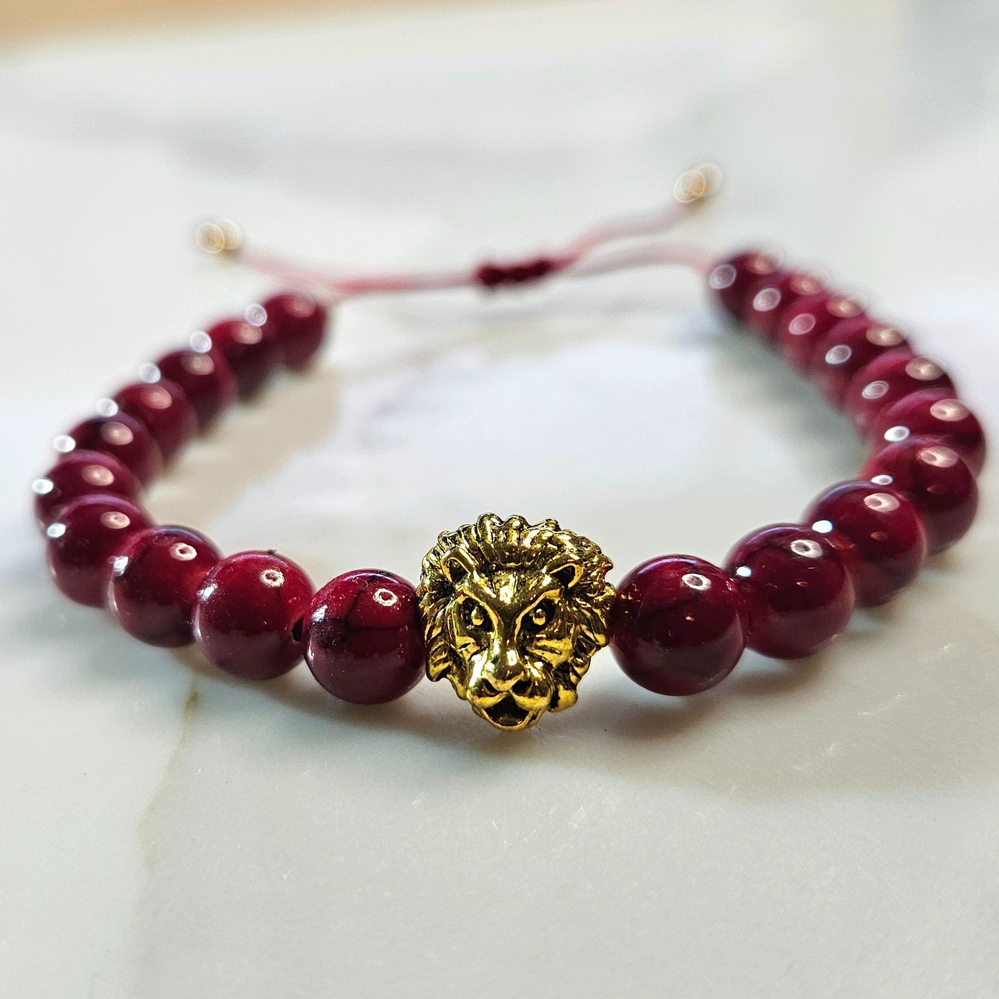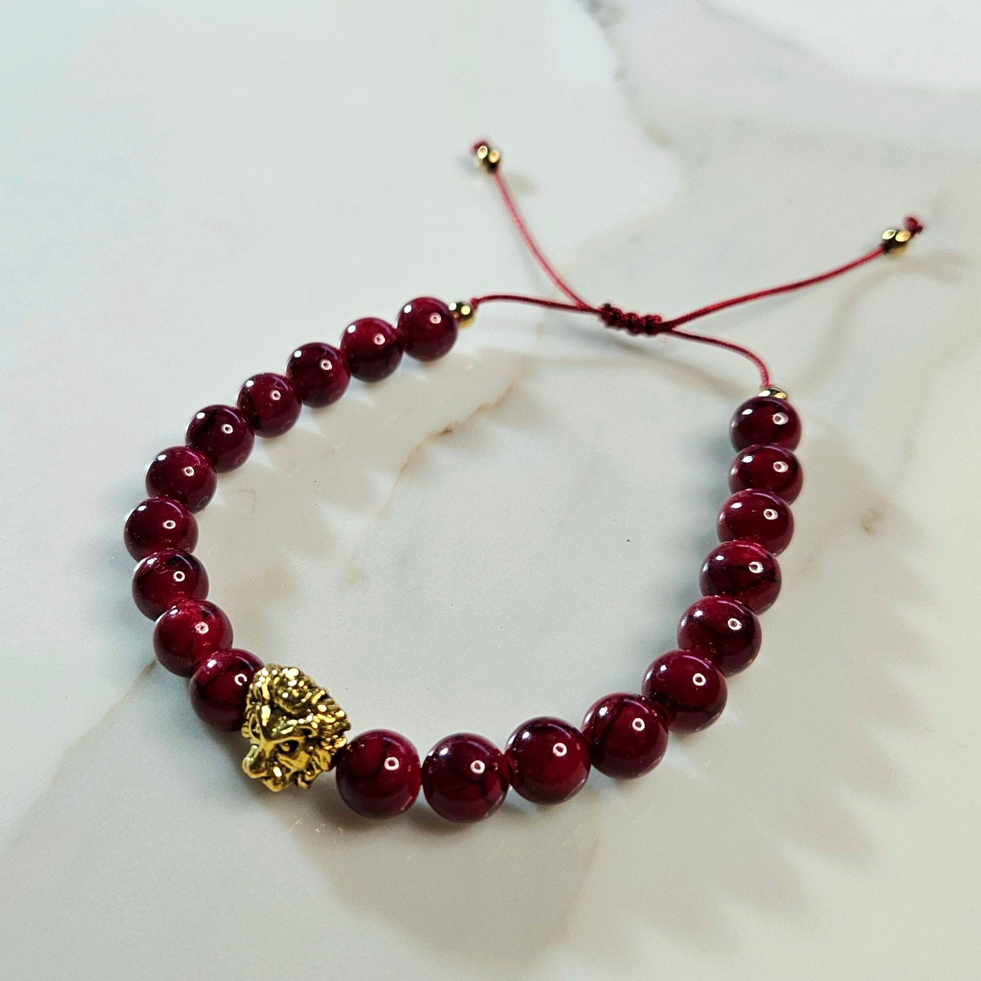 Ce bracelet ajustable en quartz rouge symbolise la force, la passion et la vitalité. Sa breloque tête de lion dorée incarne le courage et le leadership.