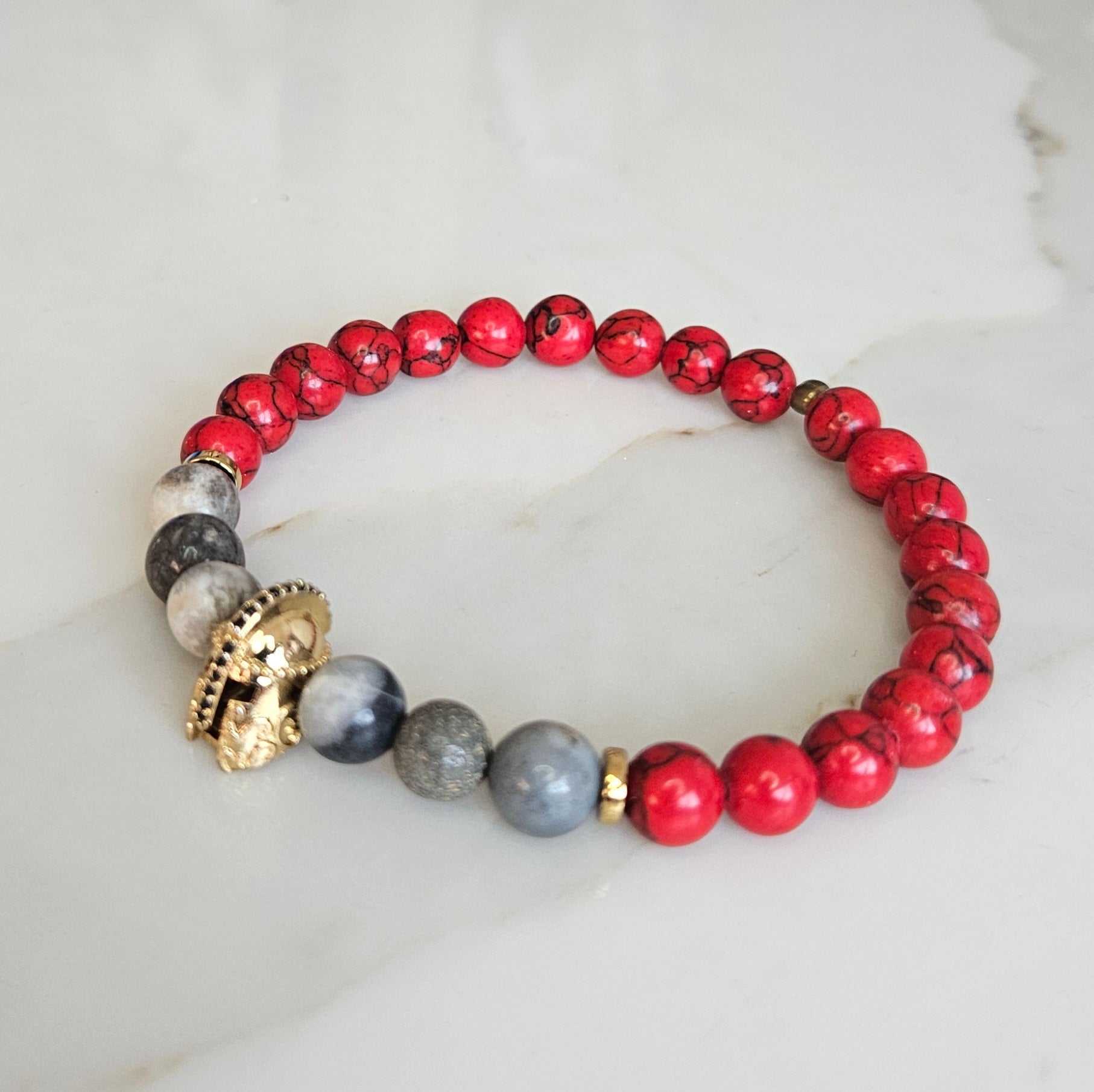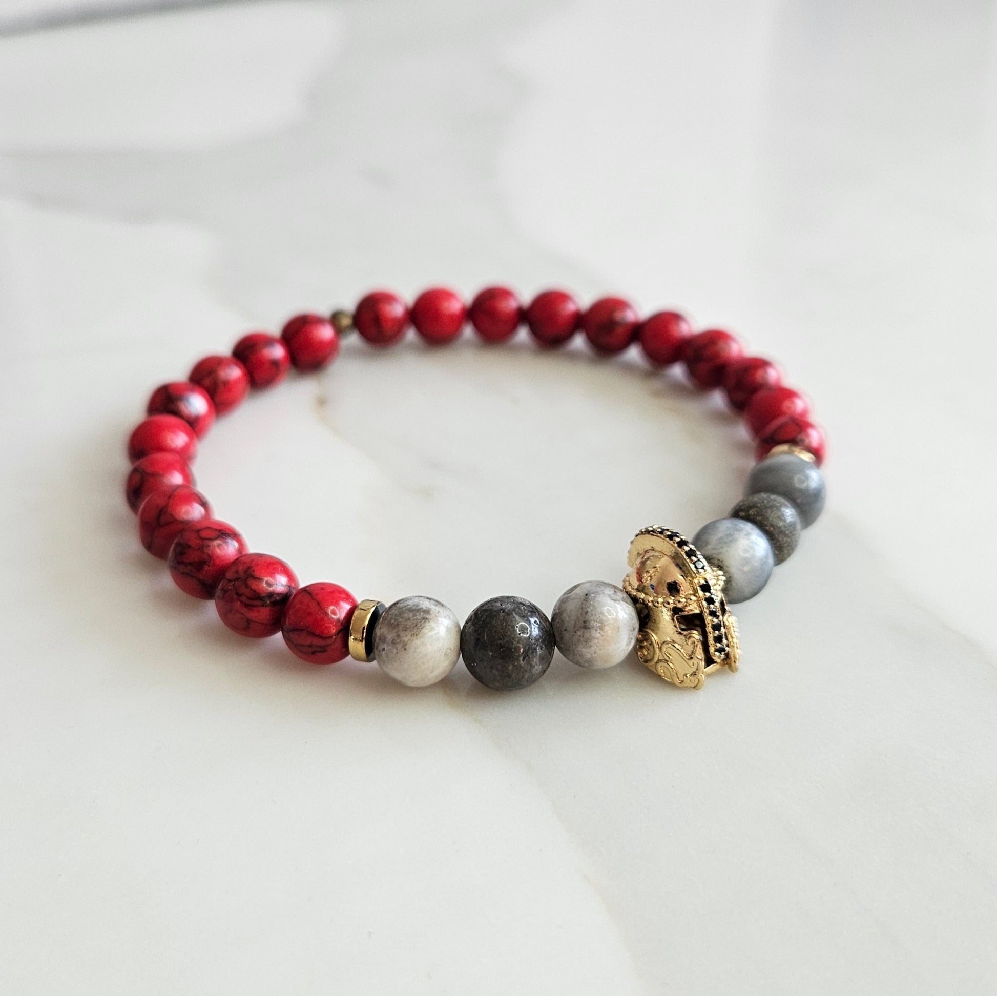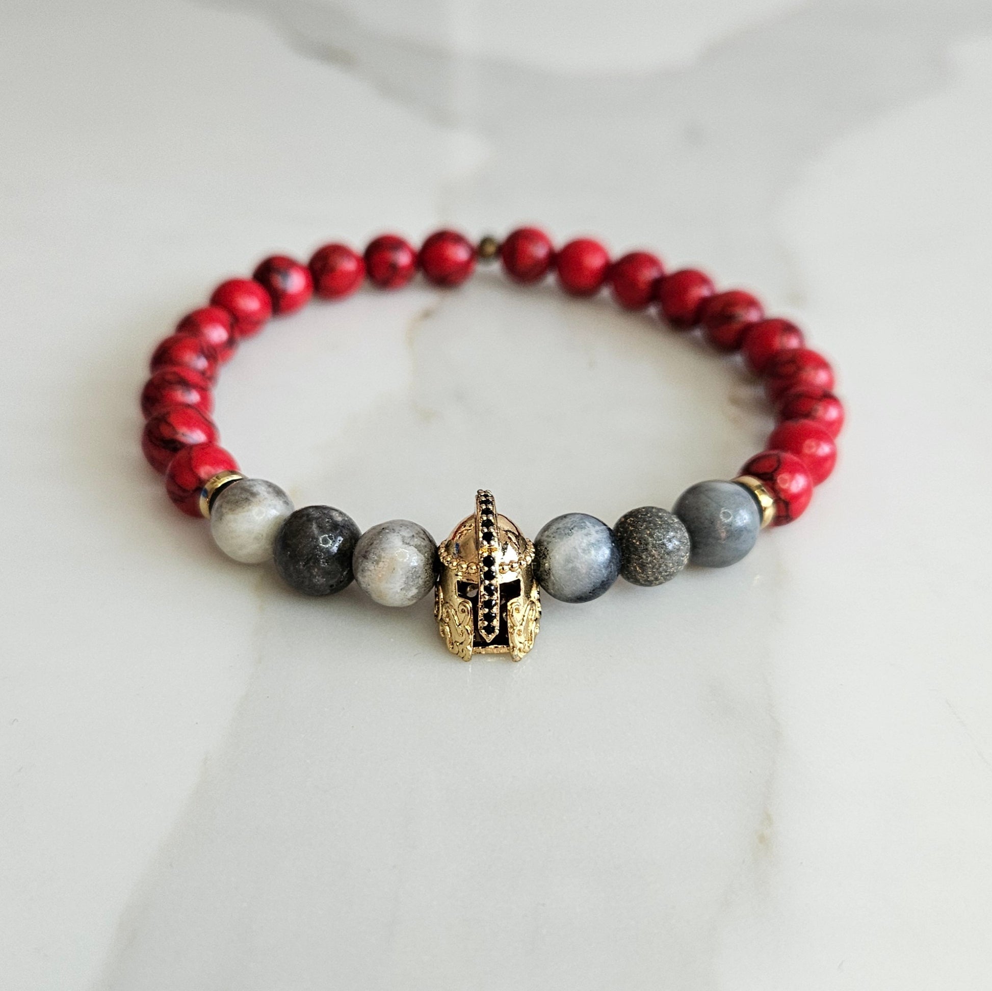 Affirmez votre force intérieure avec ce bracelet pour homme, conçu en howlite rouge aux motifs distinctifs et en agate noire illustrée, pour un contraste saisissant. Au centre, un imposant casque de guerrier sparte, doré et détaillé, incarne le courage, l'honneur et la discipline.