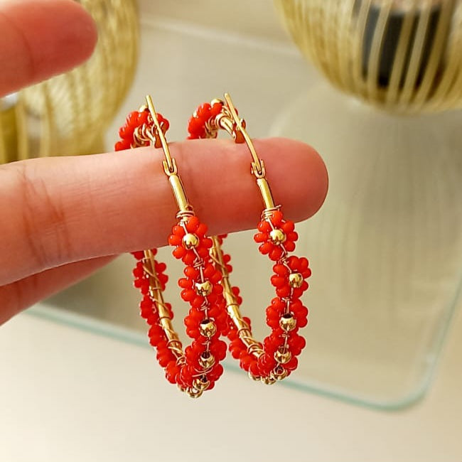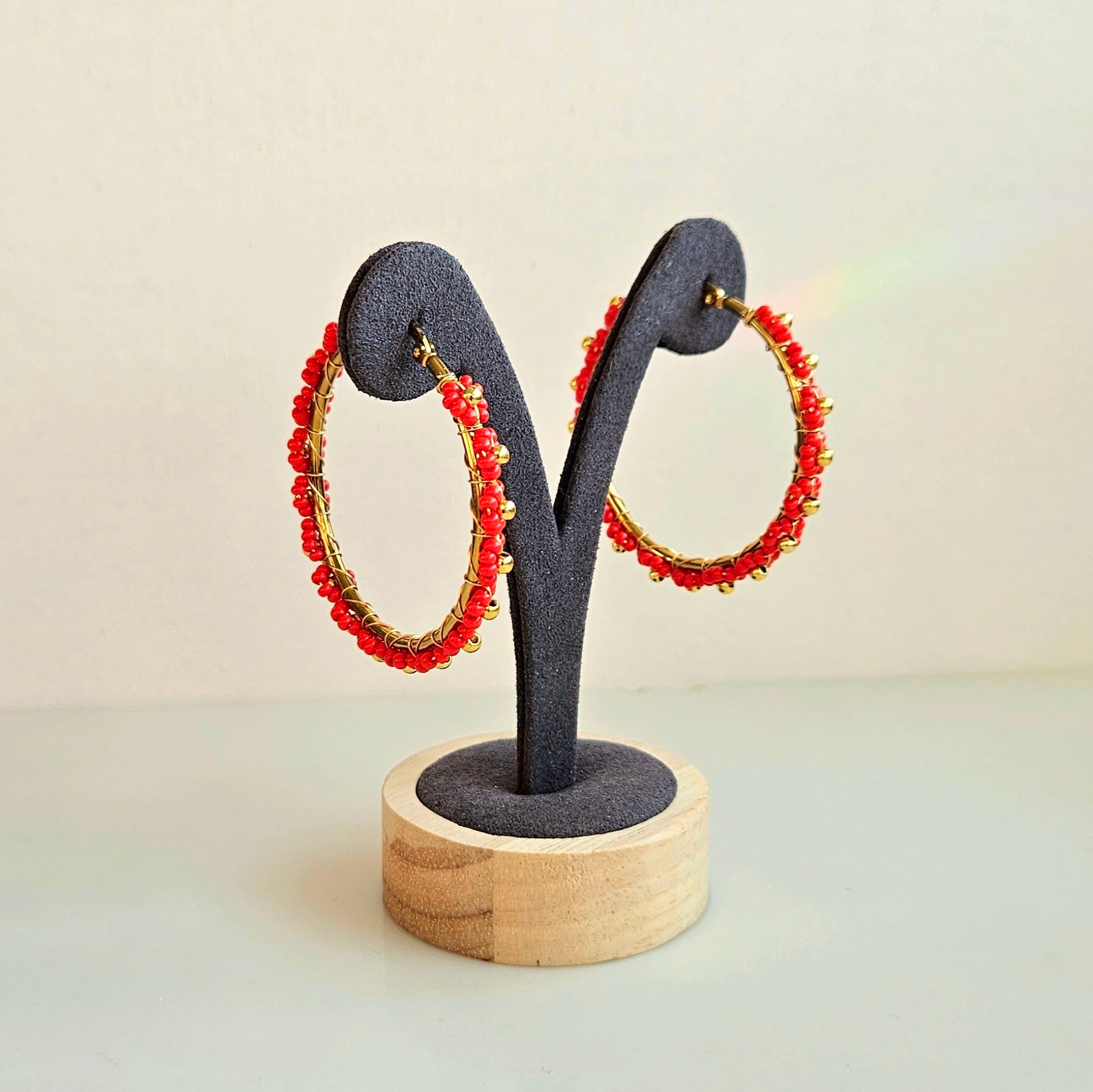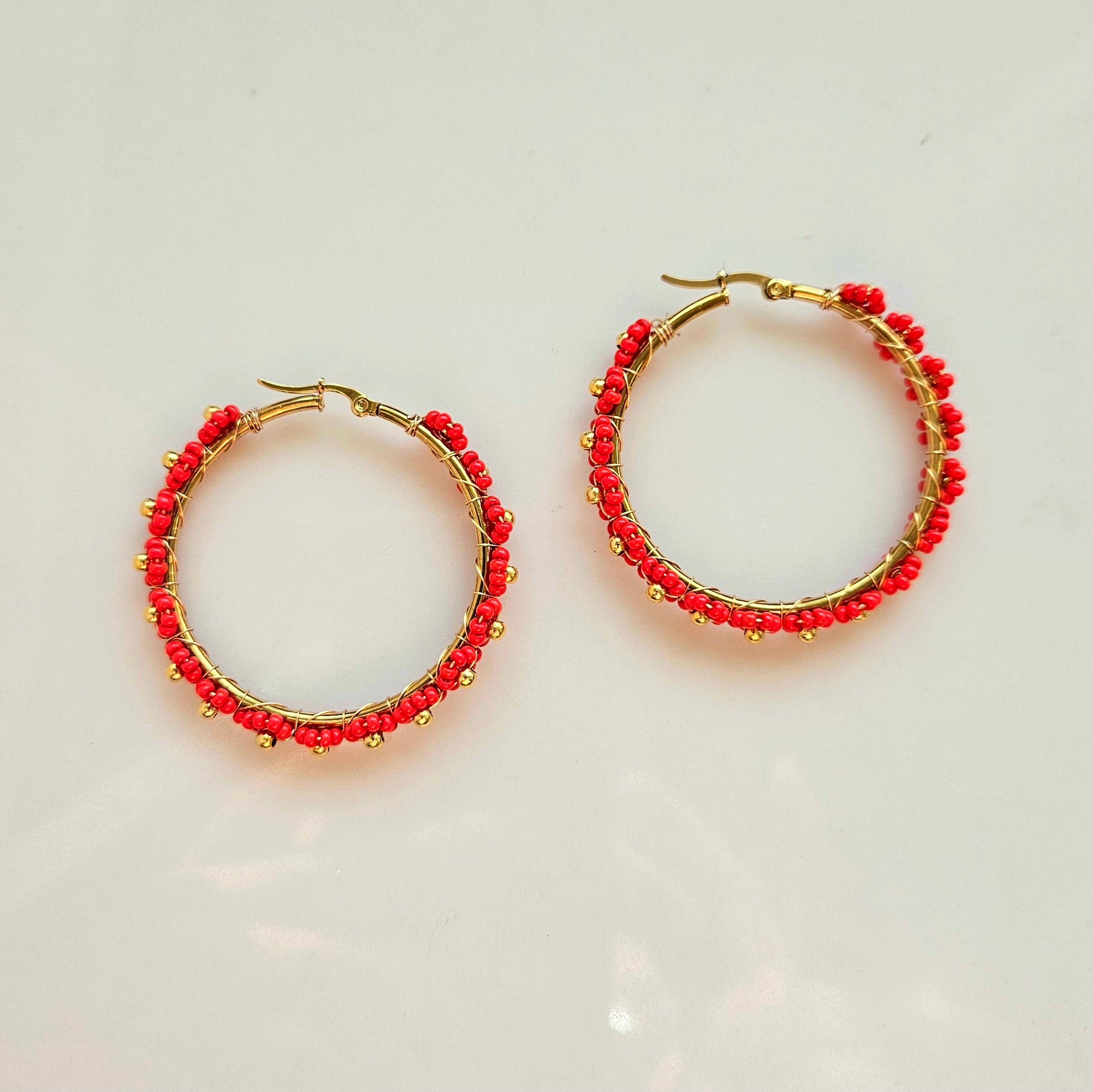 Élégantes créoles dorées ornées de perles rouges vibrantes. Un classique chic pour toute occasion.
