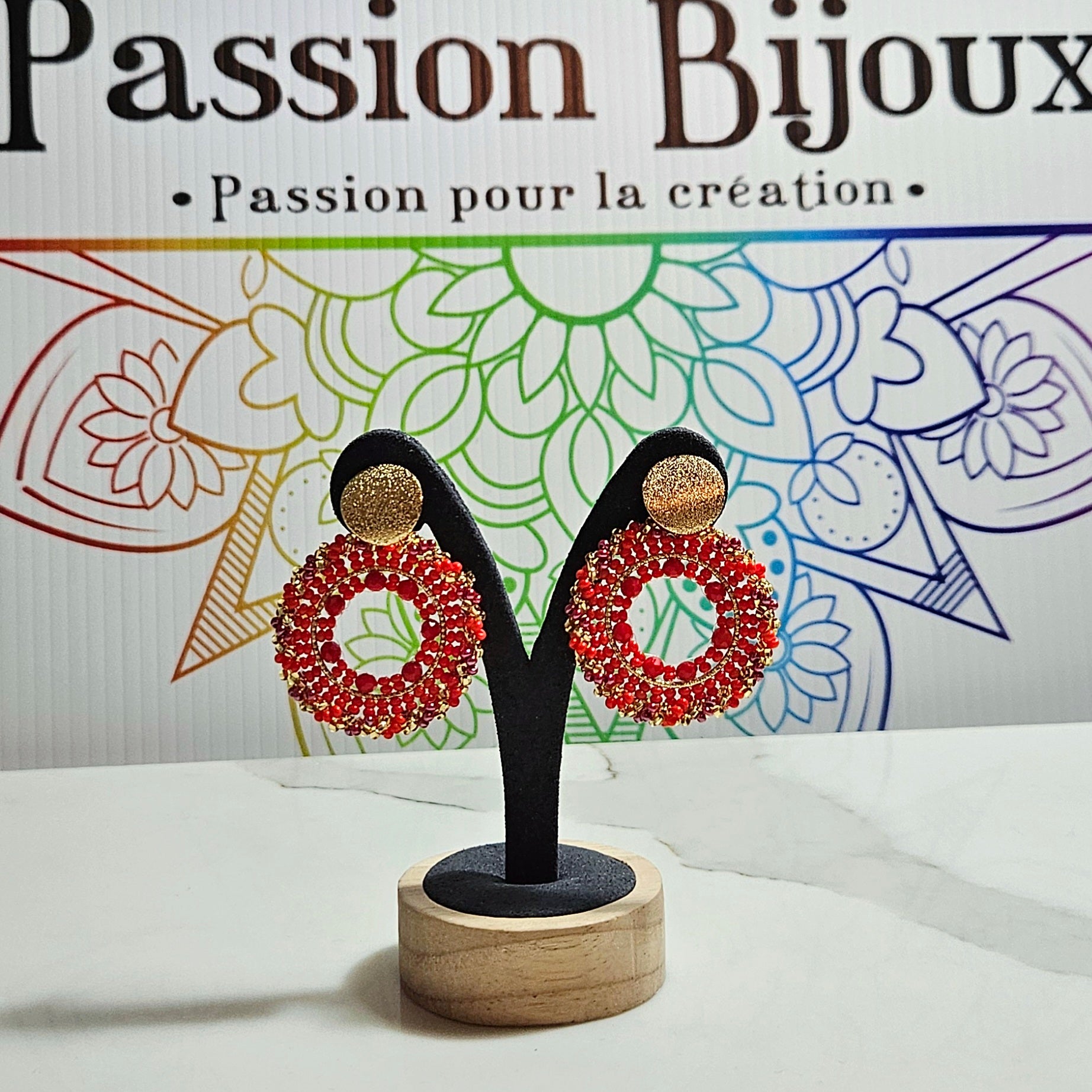Créoles Soleil Rouge en Perles & Or - Pièce unique