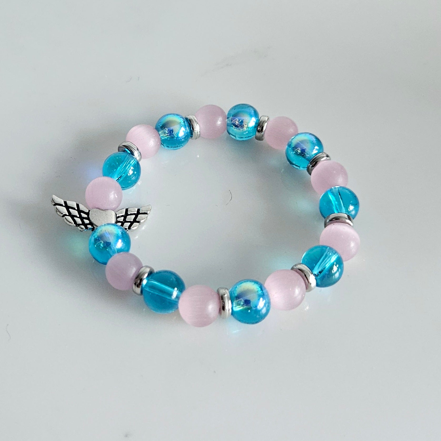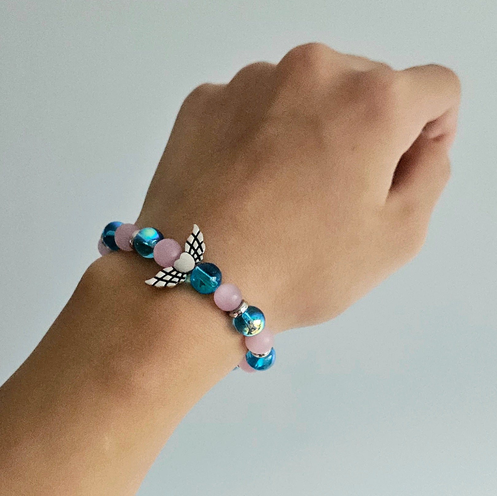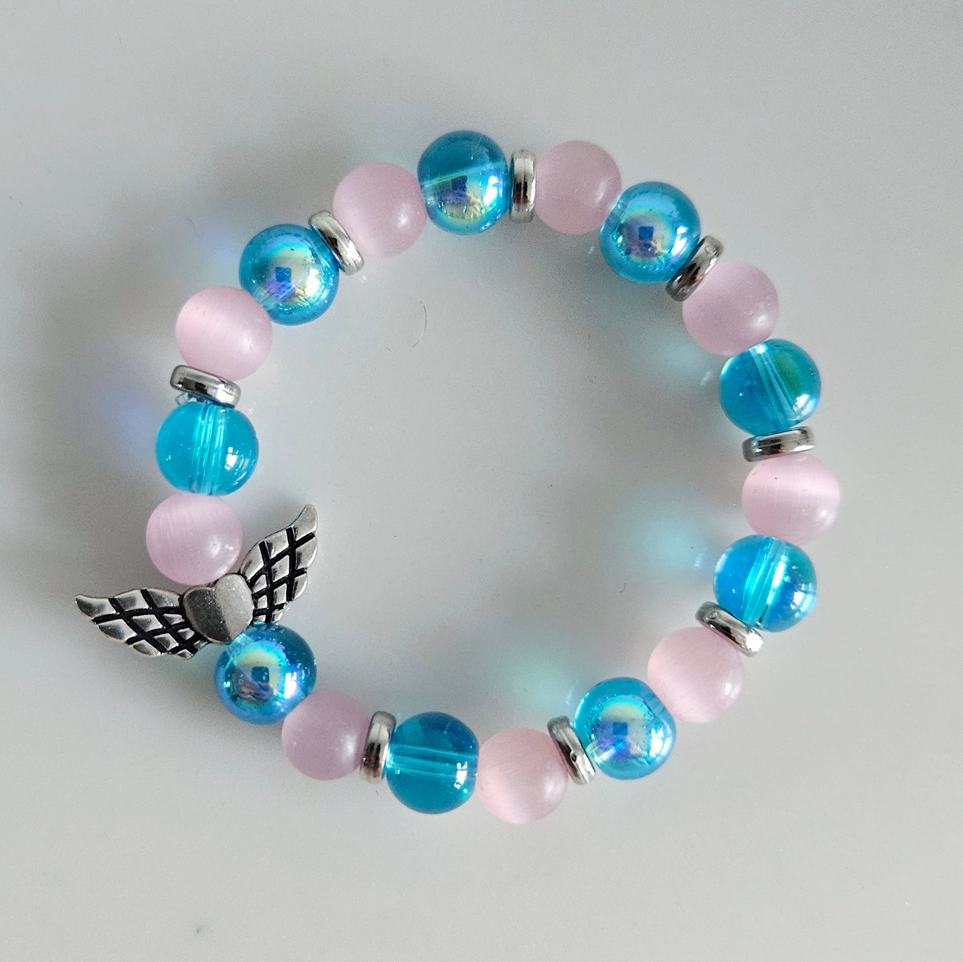 Ce bracelet pour enfant se distingue par sa combinaison de perles en quartz rose et de perles bleues lumineuses et irisées.