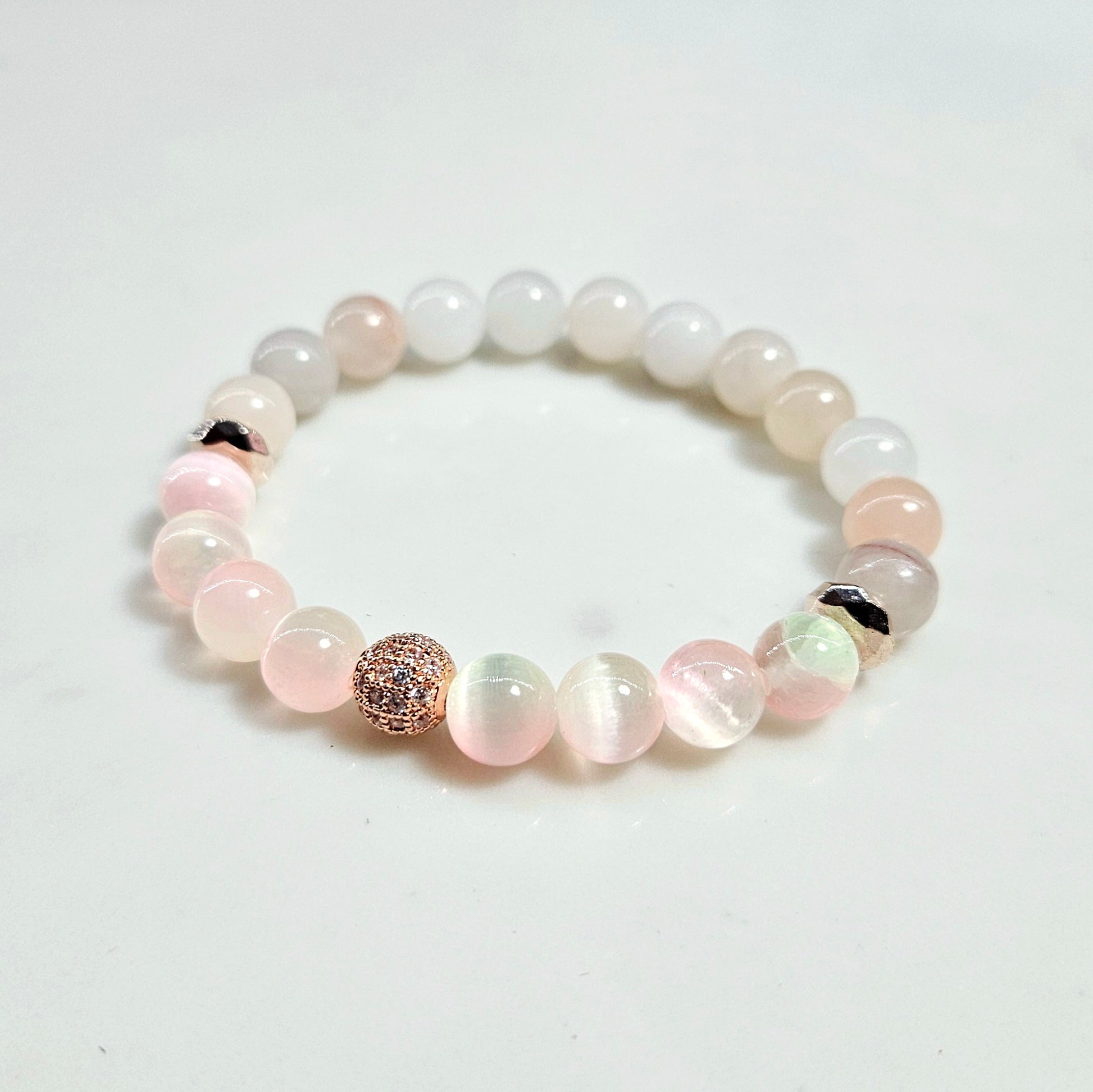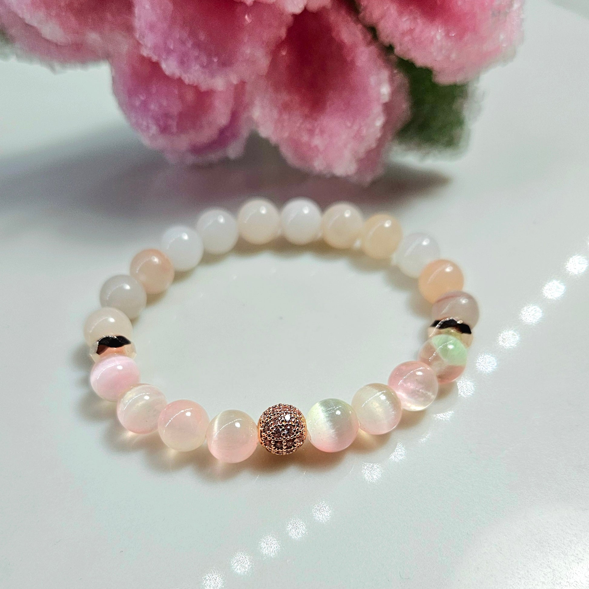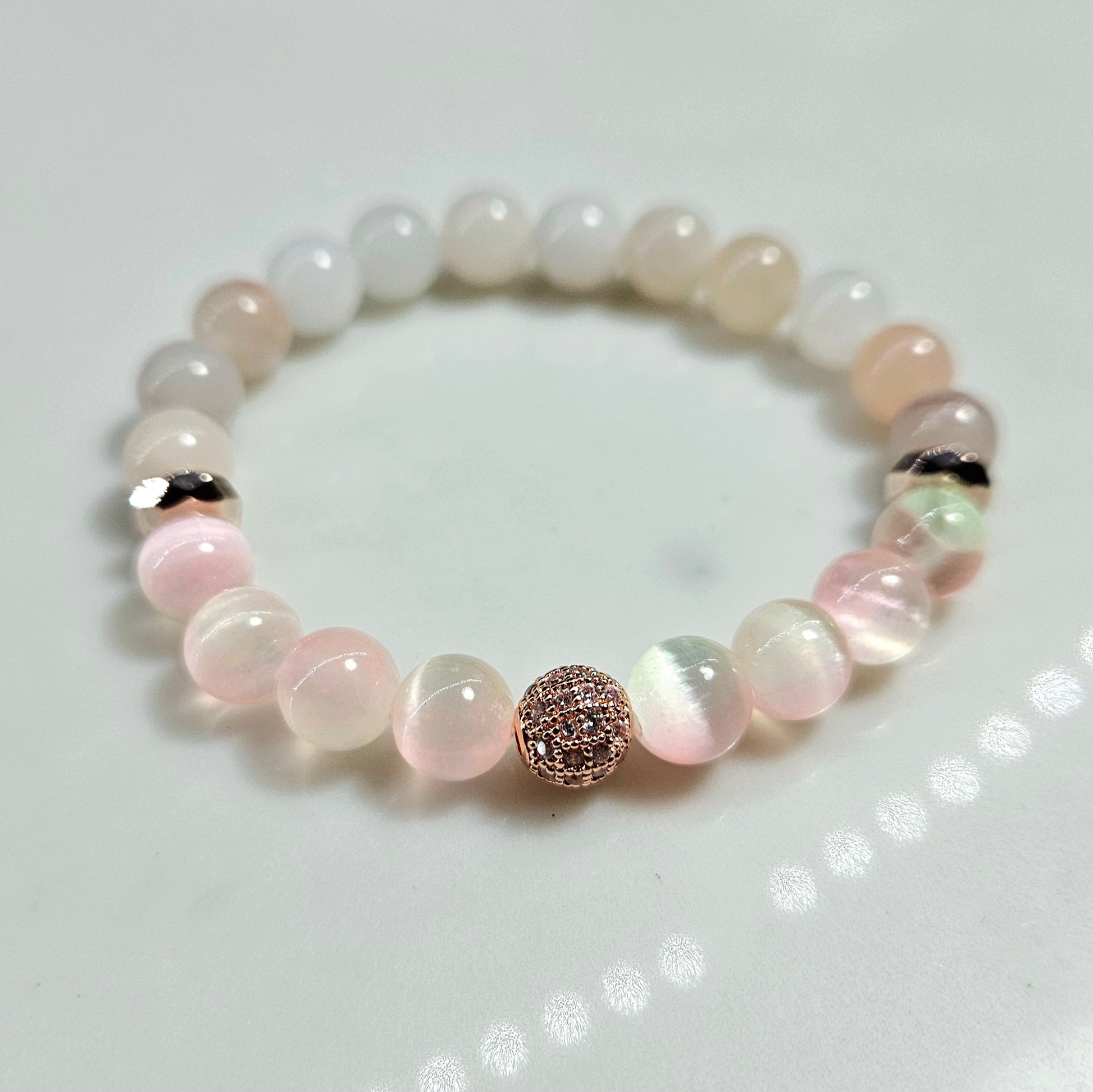 Bracelet en sélénite et opale rose. Sa perle centrale pavé ajoute une touche d'éclat subtile. Idéal pour apporter harmonie et apaisement.