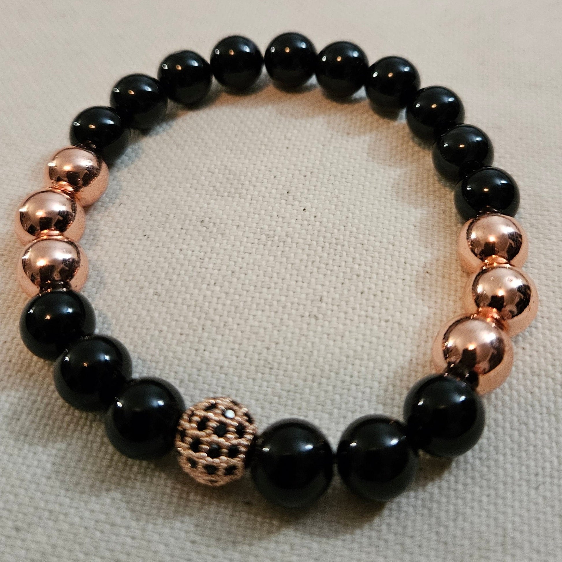 L’onyx noir et l’hématite dorée rose s’unissent dans ce bracelet élégant et équilibré. Une création à la fois puissante et féminine, idéale pour apporter ancrage, énergie et raffinement à votre quotidien.