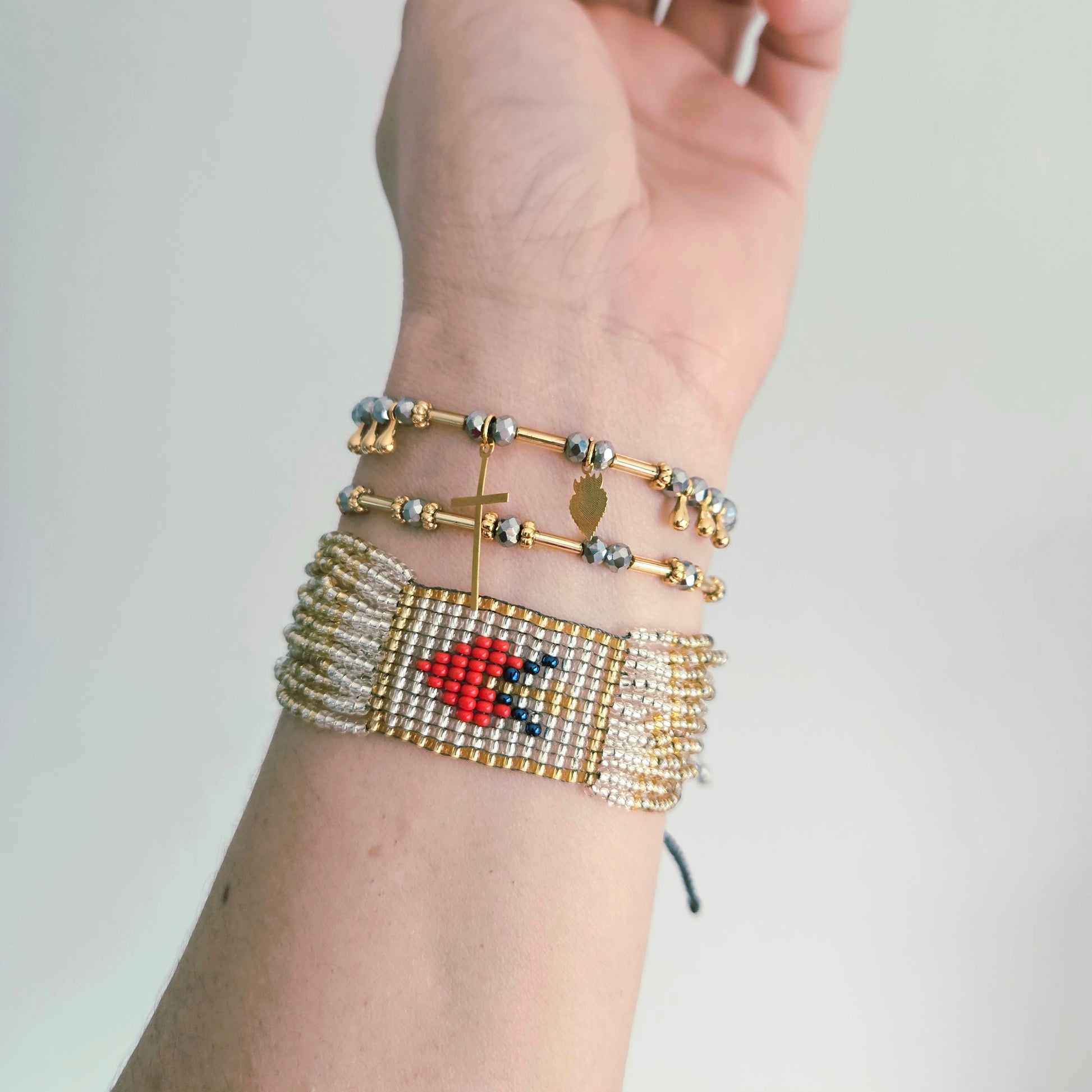 Ensemble de bracelets ajustables : un large en perles blanc et bleu/doré avec cœur sacré tissé, et deux bracelets fins en perles dorées/grises avec croix et cœur. Élégance spirituelle et superposable.