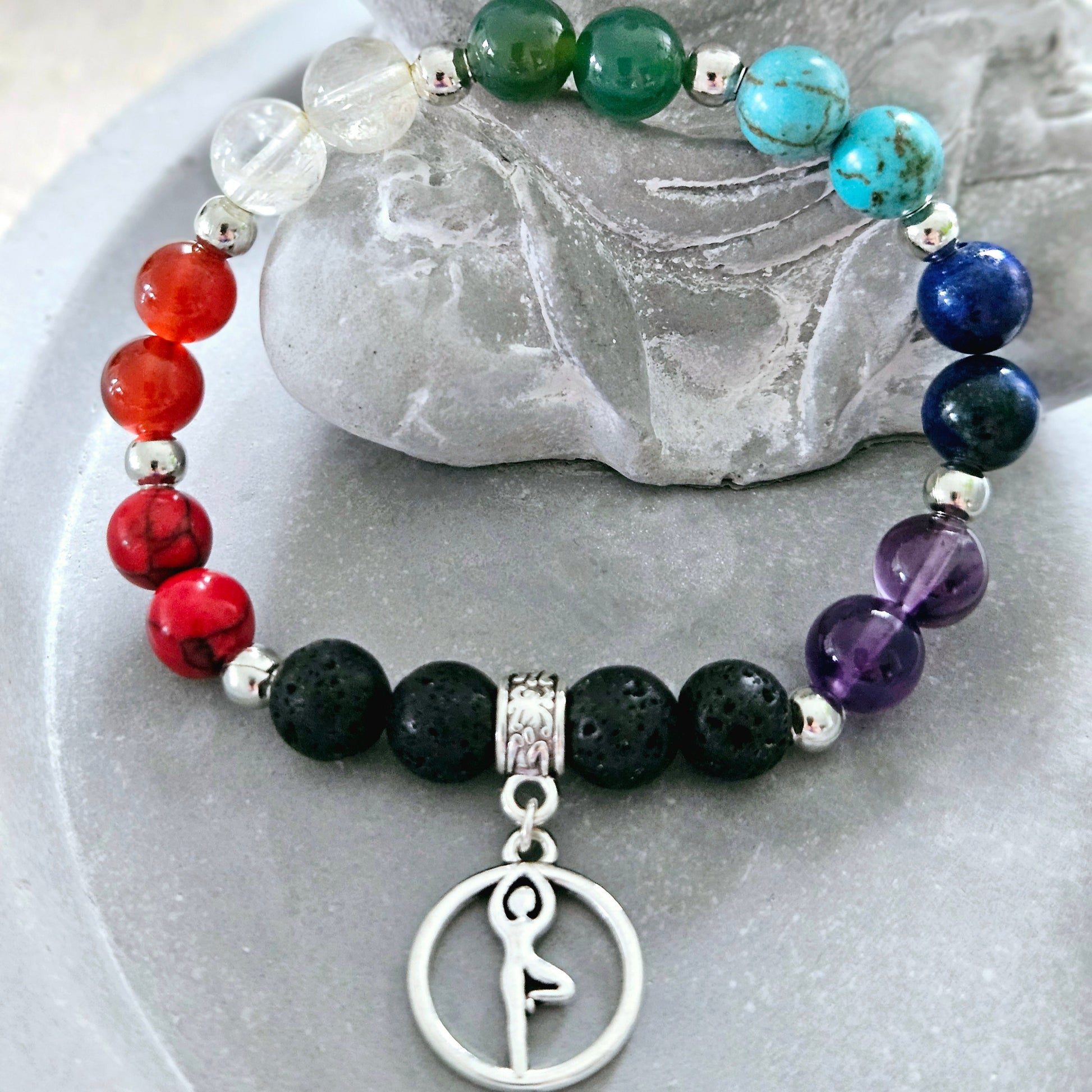 Bracelet en pierres naturelles représentant les 7 chakras, avec perles de lave pour diffuser des huiles essentielles et une breloque symbolisant la posture de l’arbre (Muladhara).