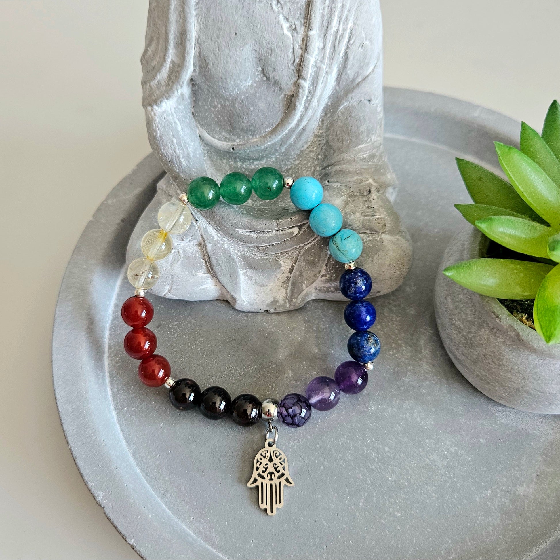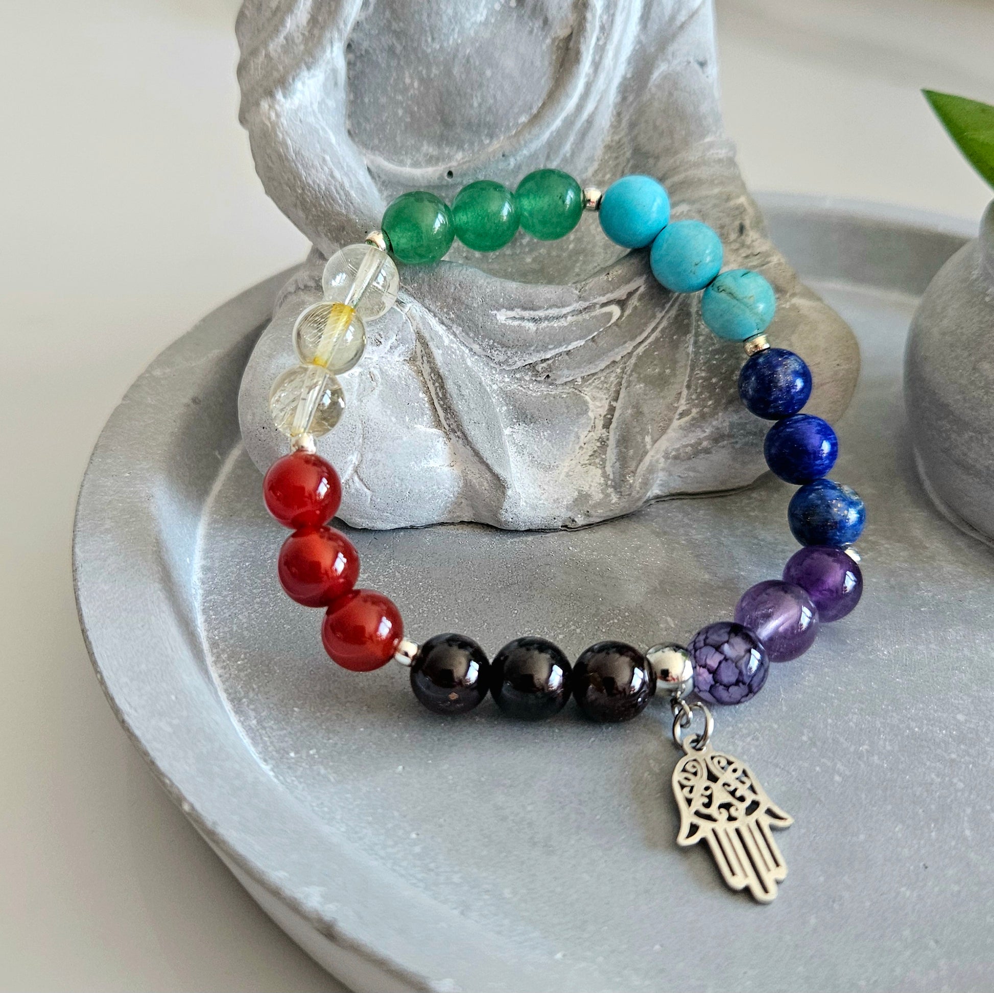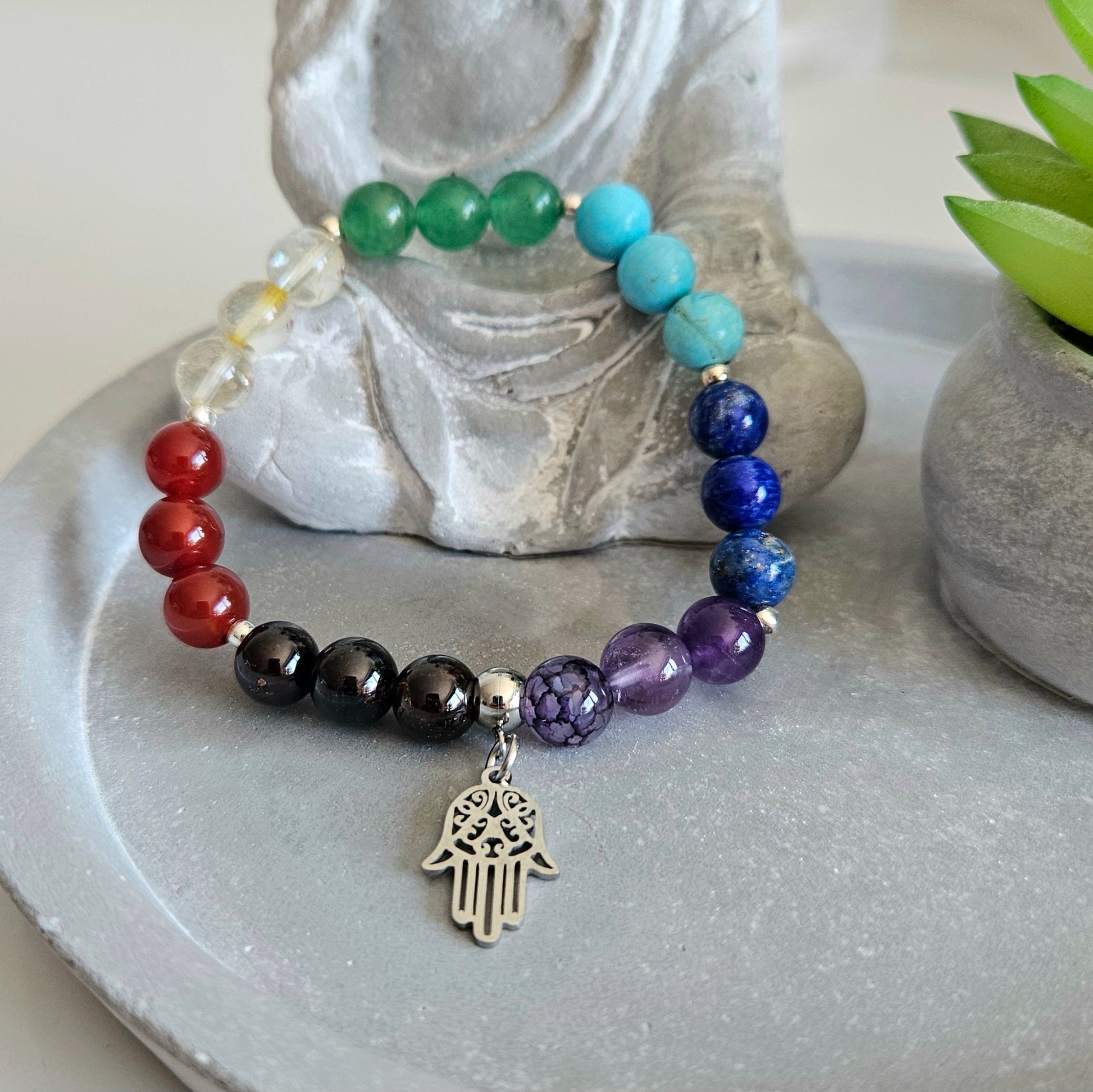 Harmonisez votre énergie avec ce bracelet 7 chakras orné d'un puissant symbole de protection, la Main de Fatma en acier inoxydable.