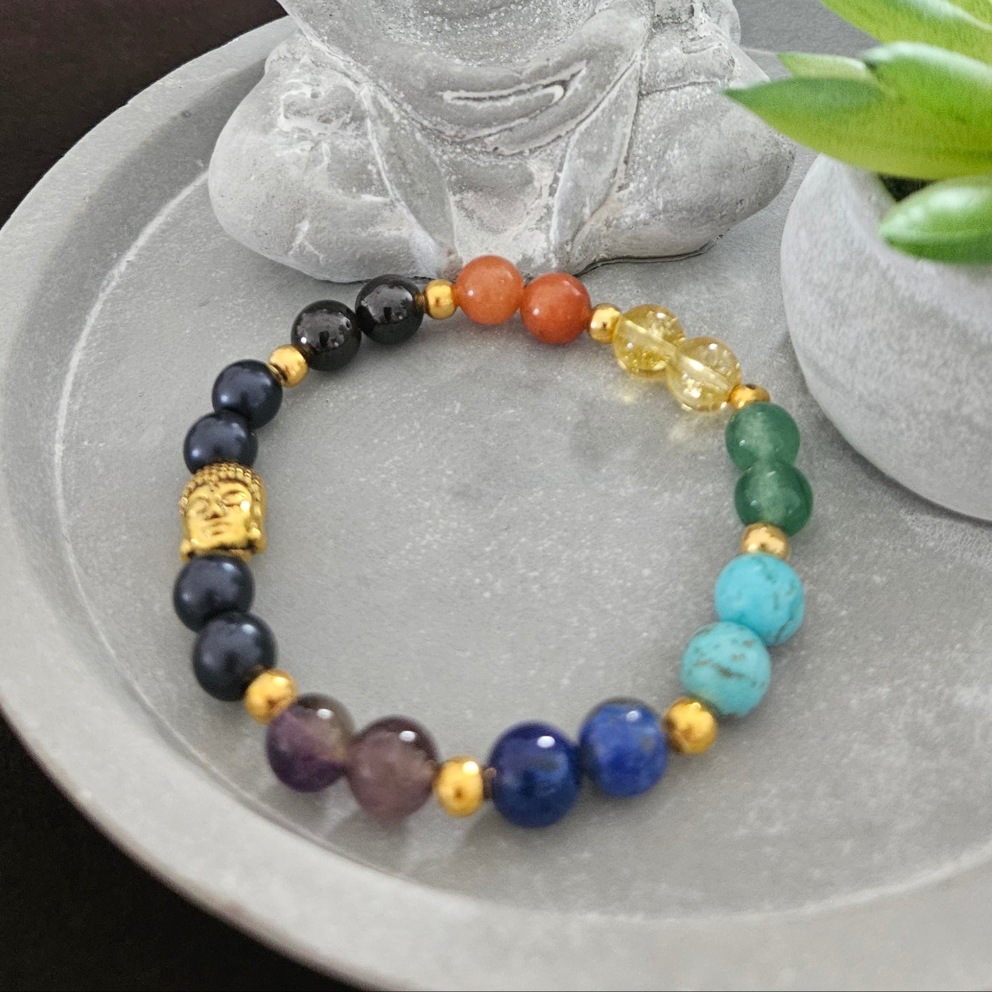 Bracelet mala 7 chakras orné d'une tête de Bouddha dorée. Ce bracelet élastique est composé de pierres naturelles représentant les sept chakras principaux. La tête de Bouddha en métal doré symbolise la paix et l'illumination.