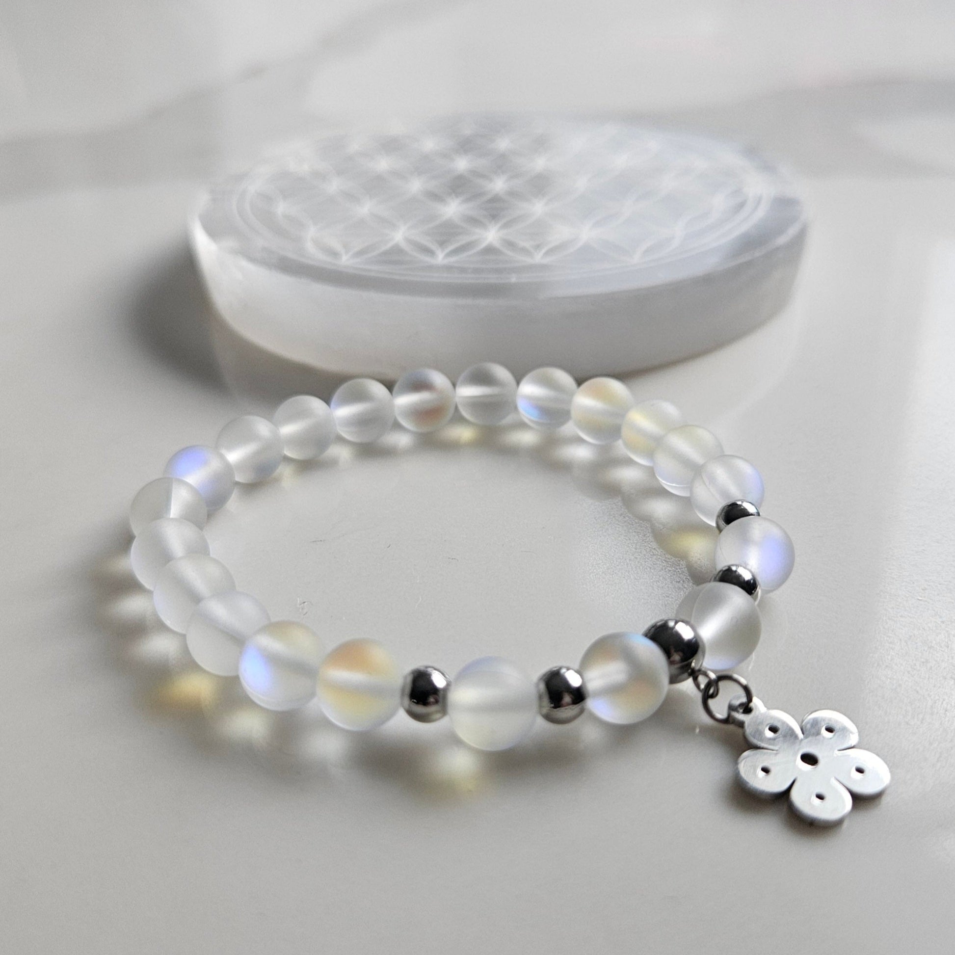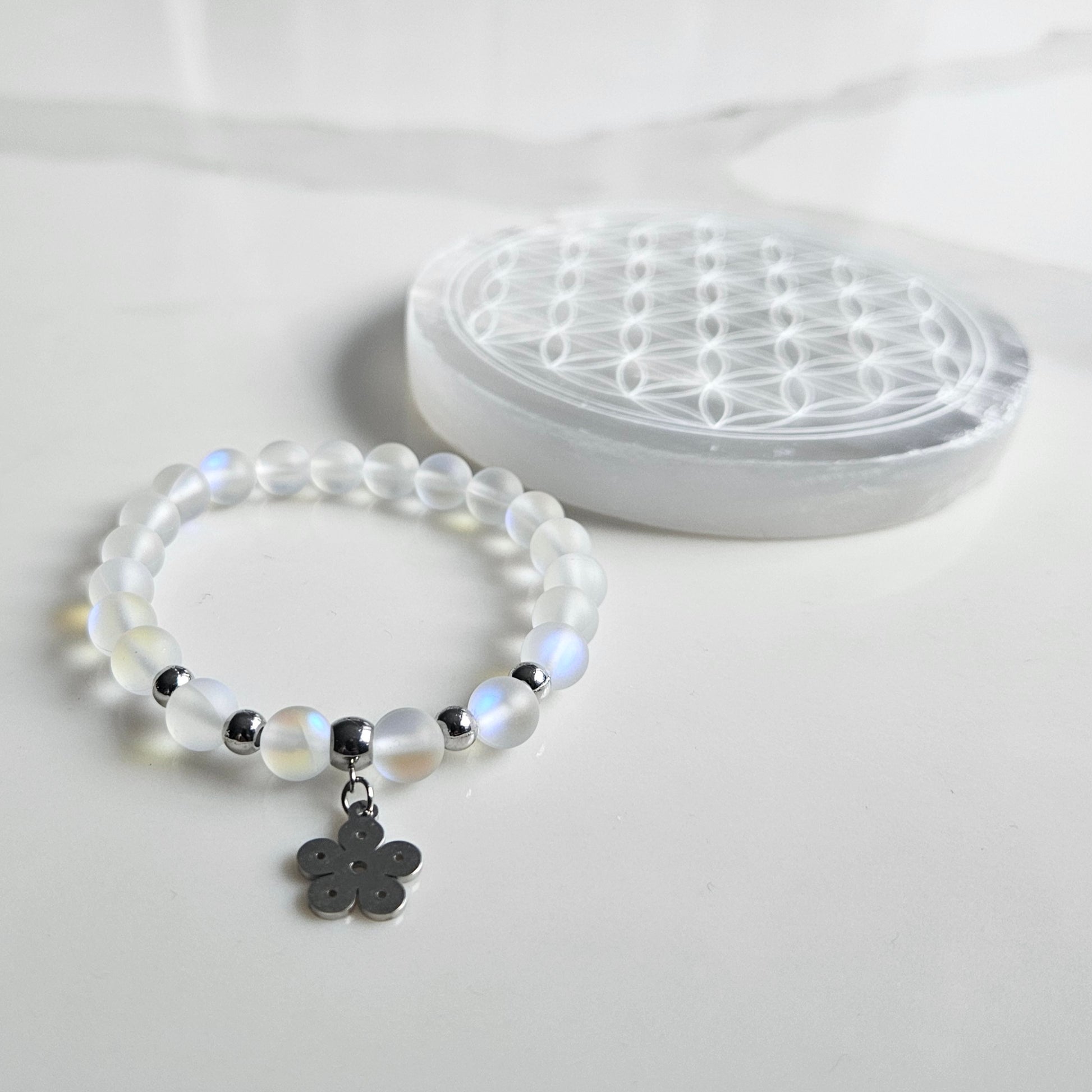 Ce bracelet est conçu avec des perles de verre irisé aux reflets arc-en-ciel qui captent la lumière. Les séparateurs et la breloque fleur sont en acier inoxydable, apportant durabilité et éclat.