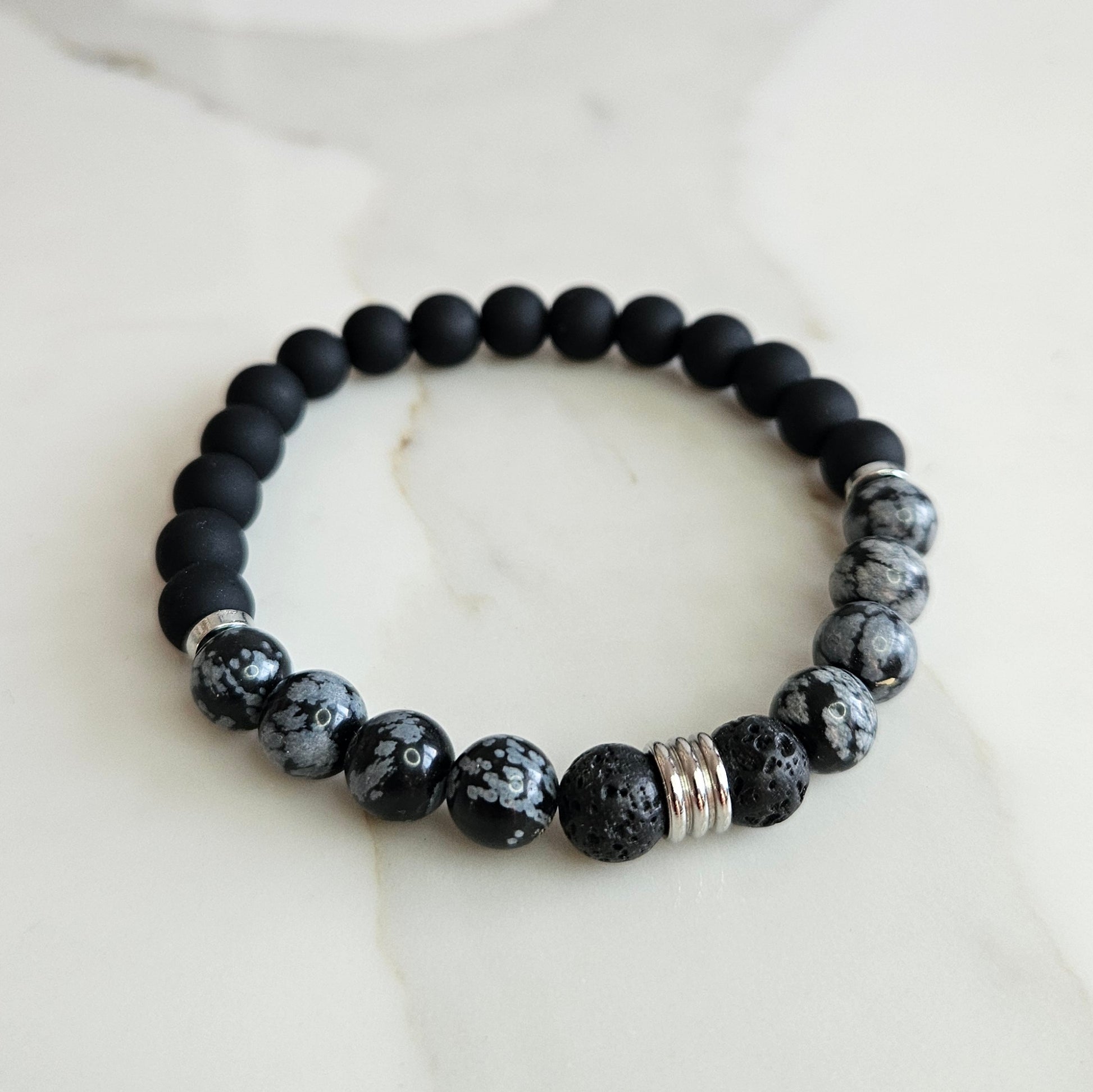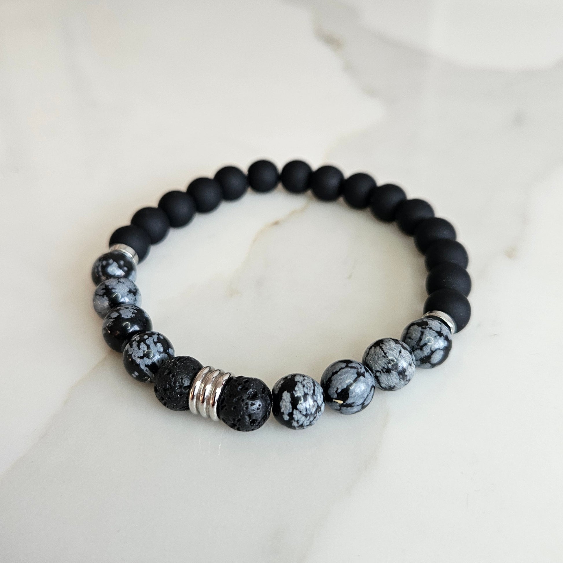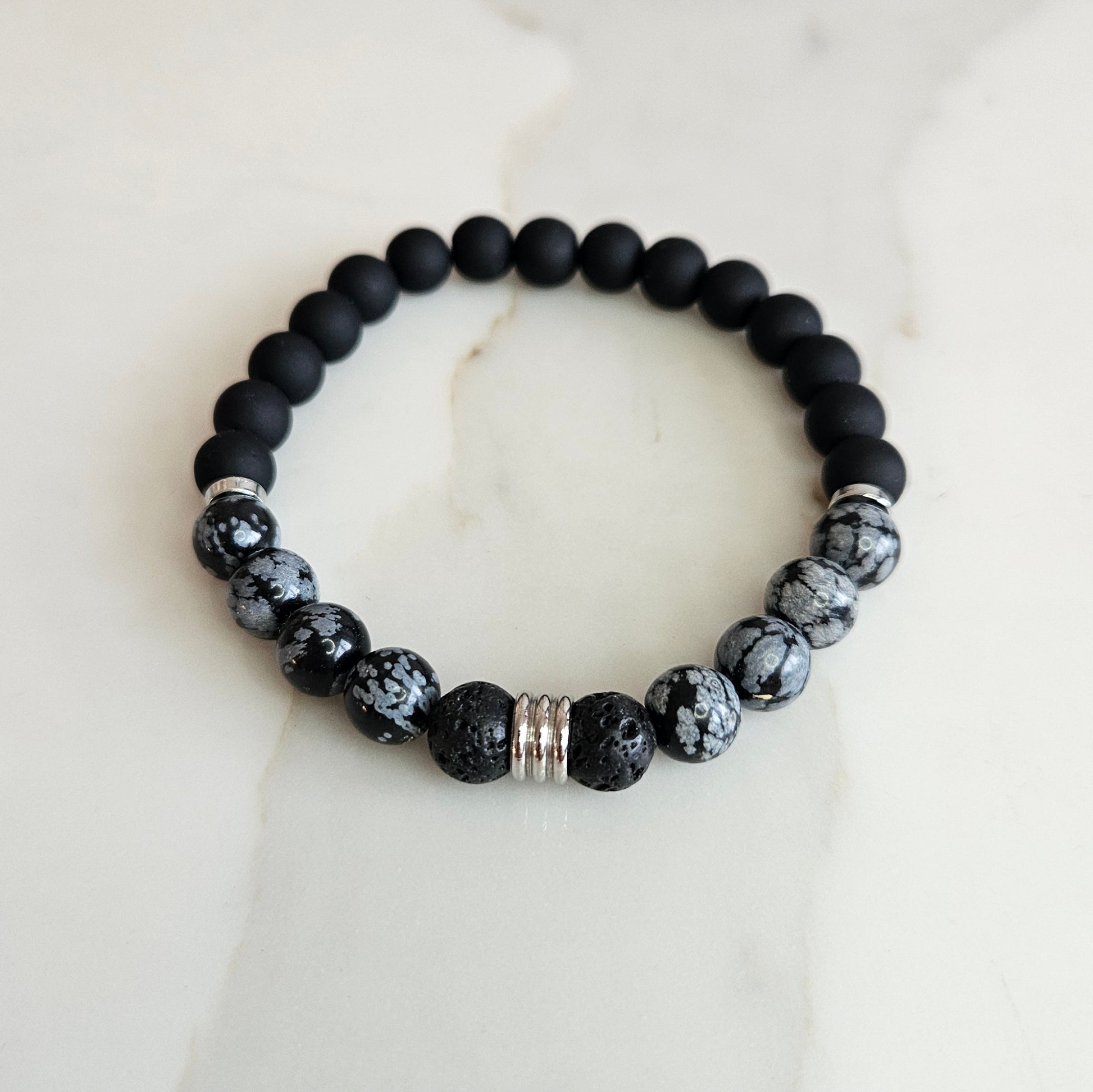 Bracelet en obsidienne flocon de neige et pierre de lave. Un bijou qui allie protection, force et ancrage.