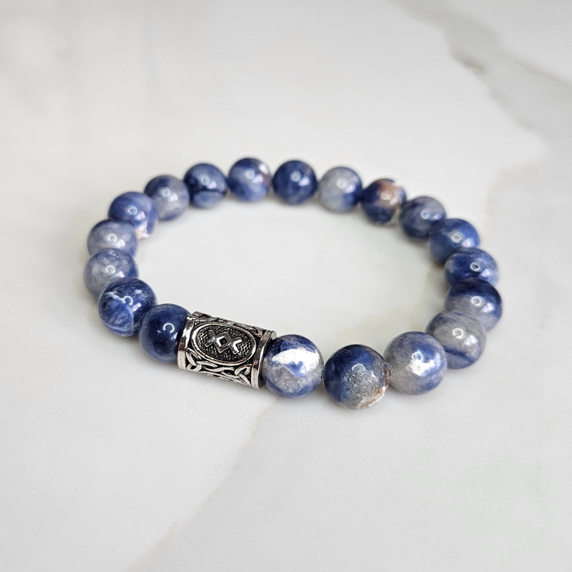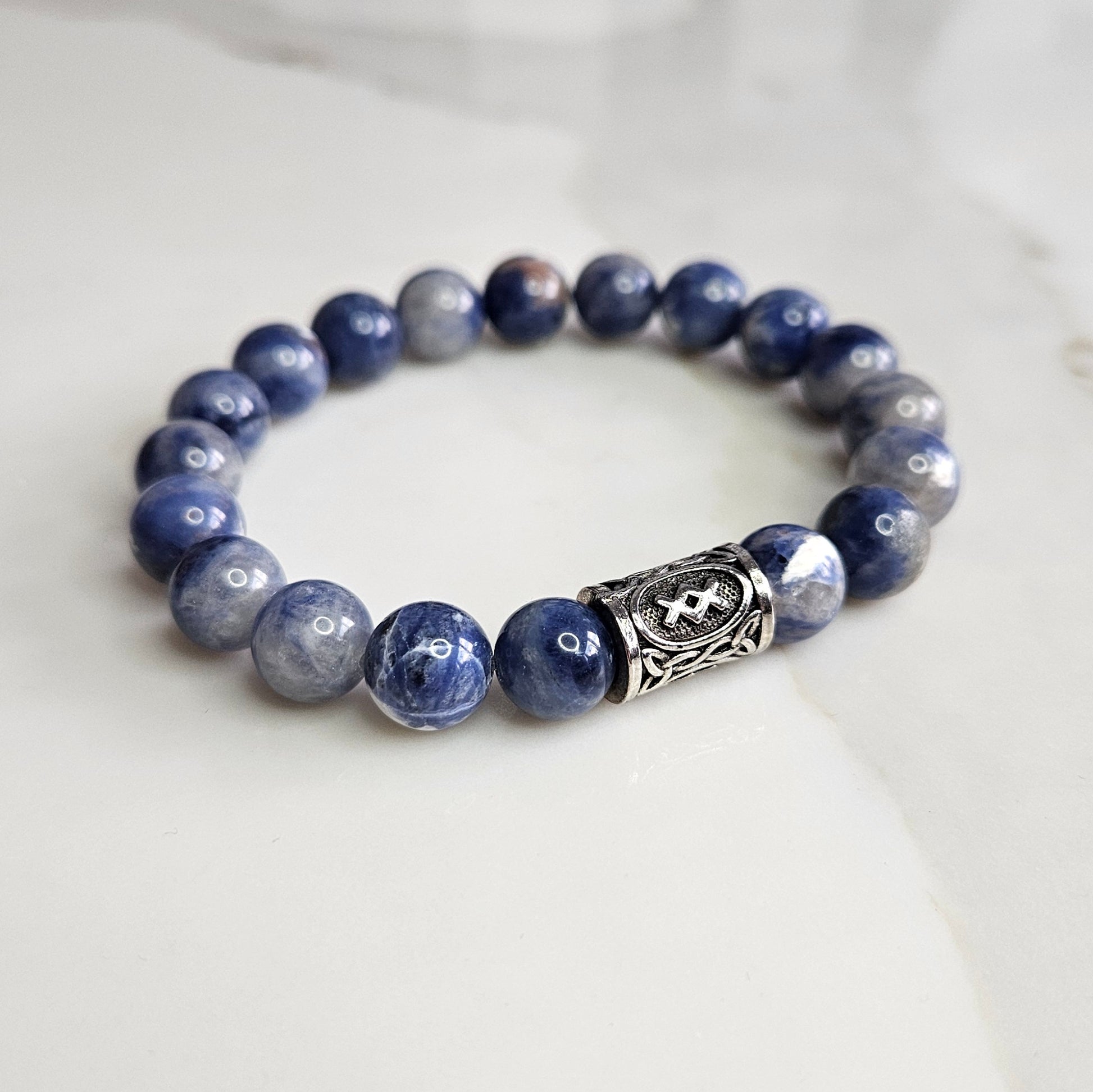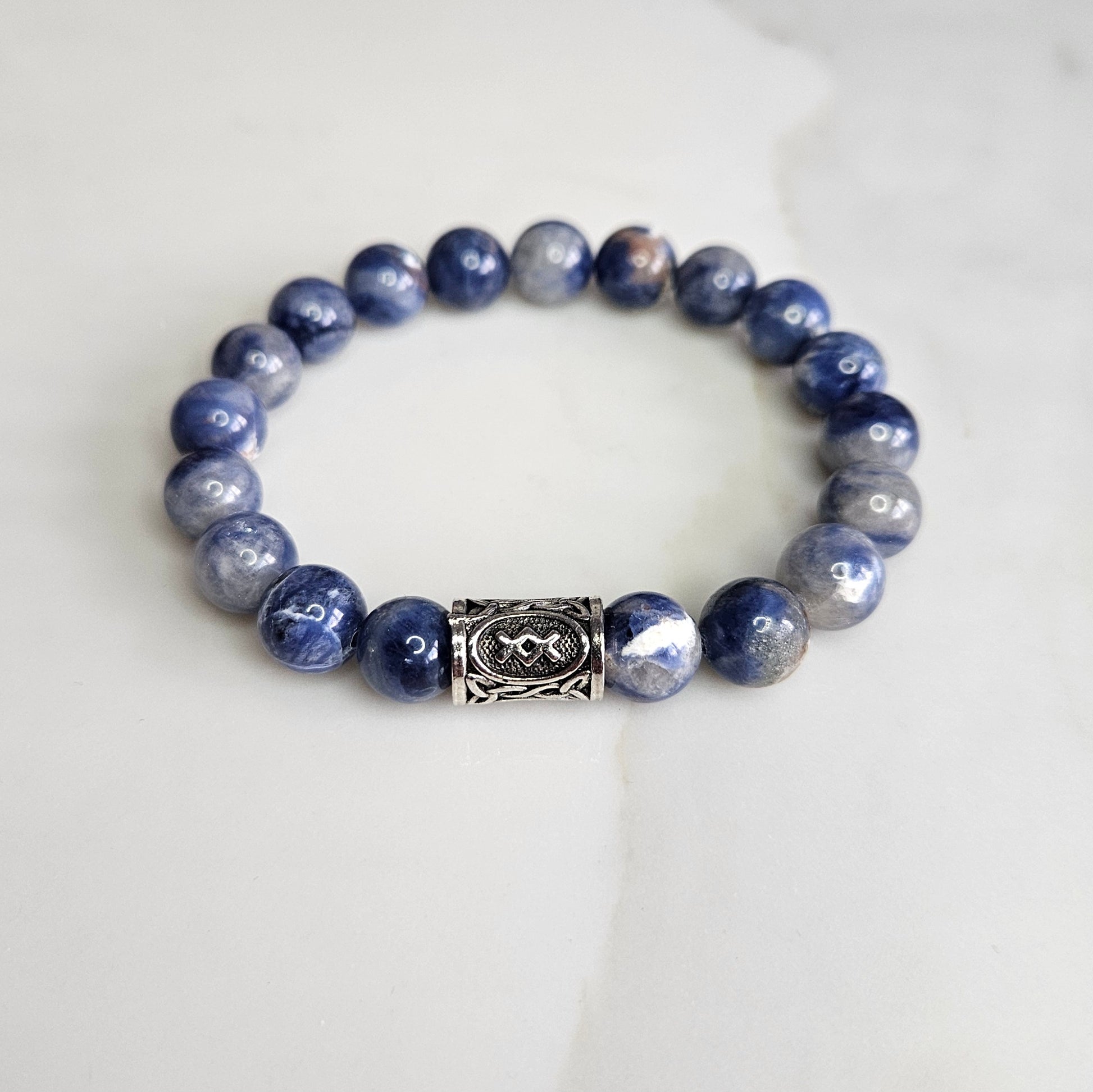 Bracelet homme en perles de sodalite bleue et grise, favorisant clarté mentale et intuition. Un tube central orné de runes ajoute une touche spirituelle et protectrice.