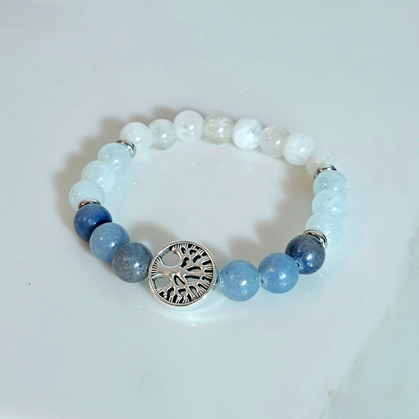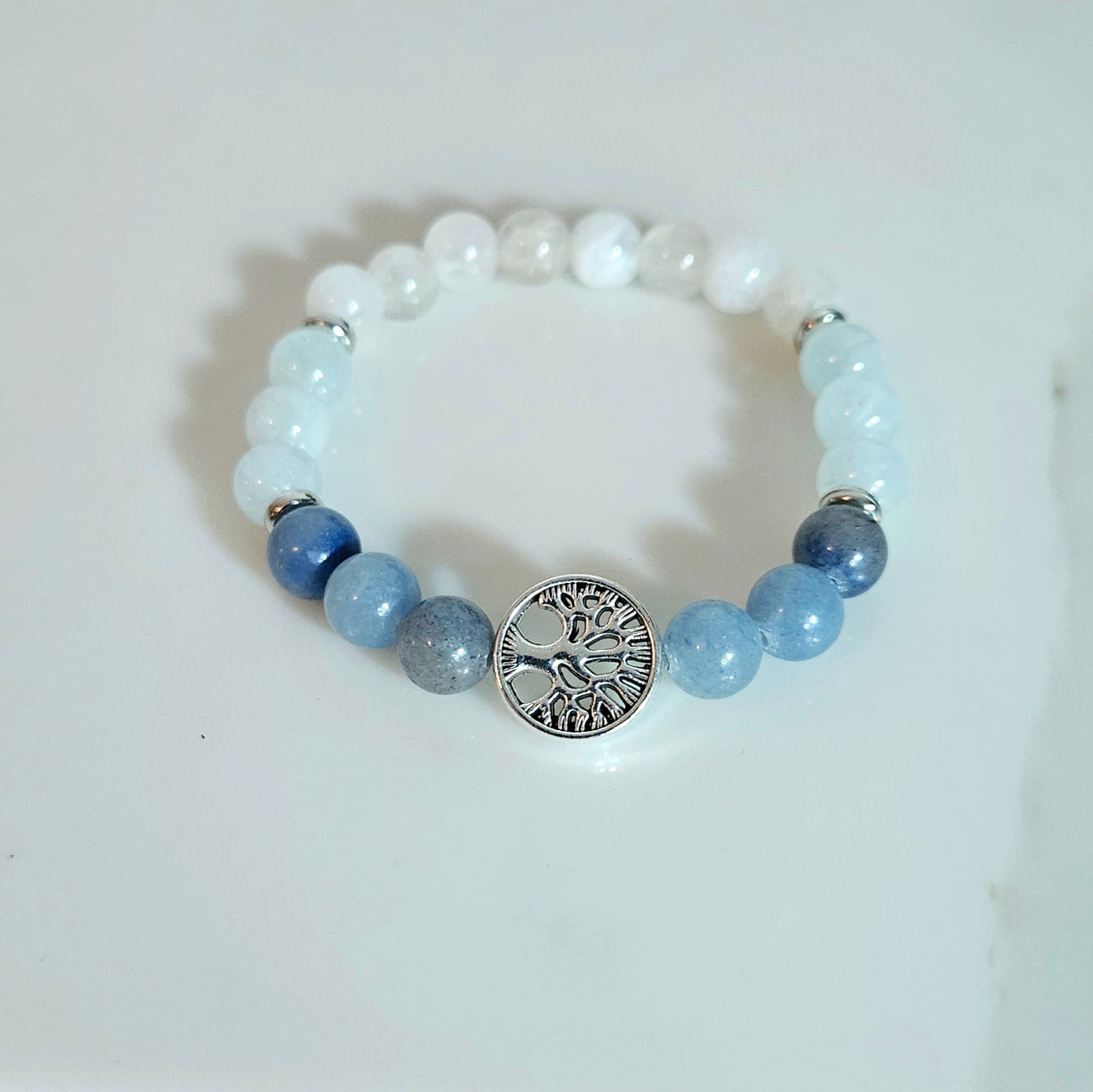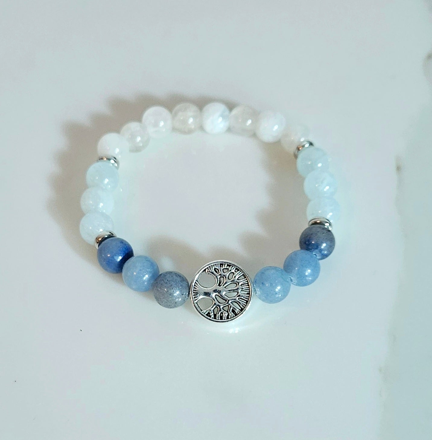 Ce bracelet en quartz bleu, aquamarine et pierre de lune incarne calme et sérénité. Les pierres semi-précieuses sot sélectionnes pour favoriser la paix intérieurs et équilibre, tandis que la breloque arbre de vie symbolise croissance et connexion spirituelle.