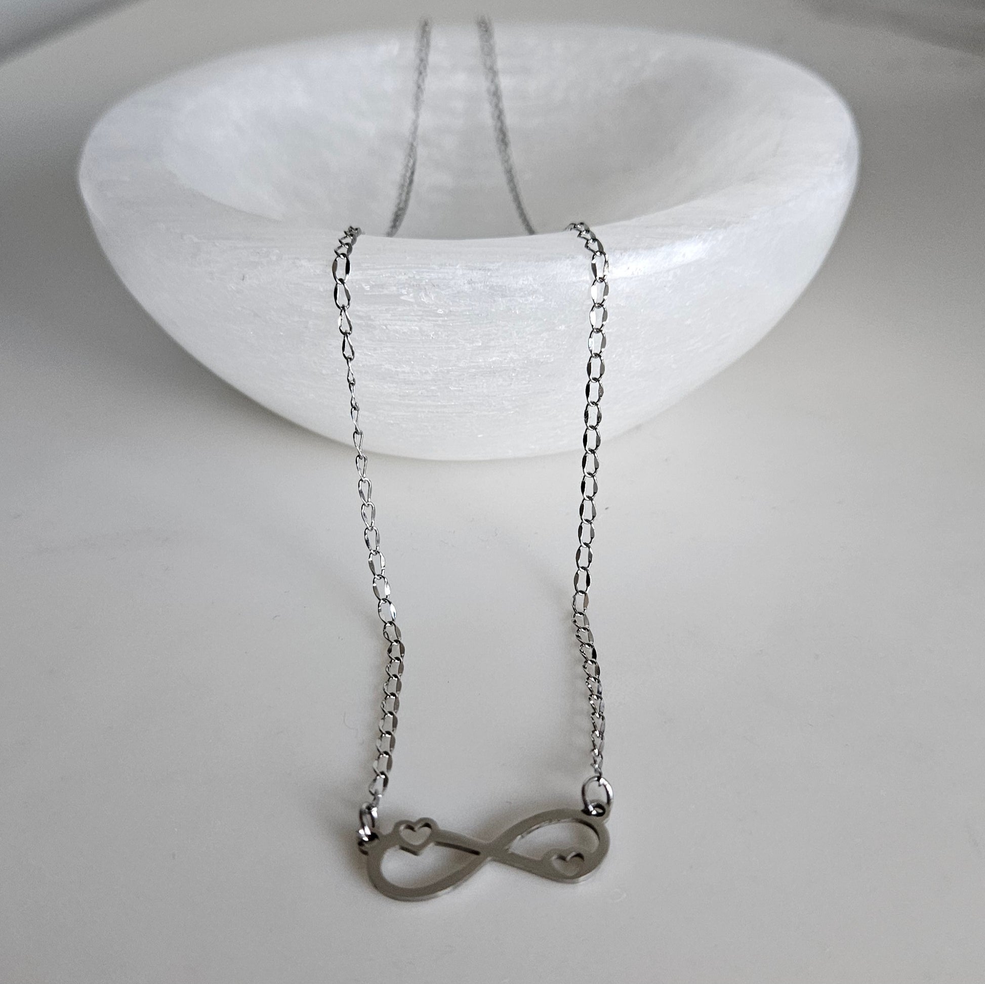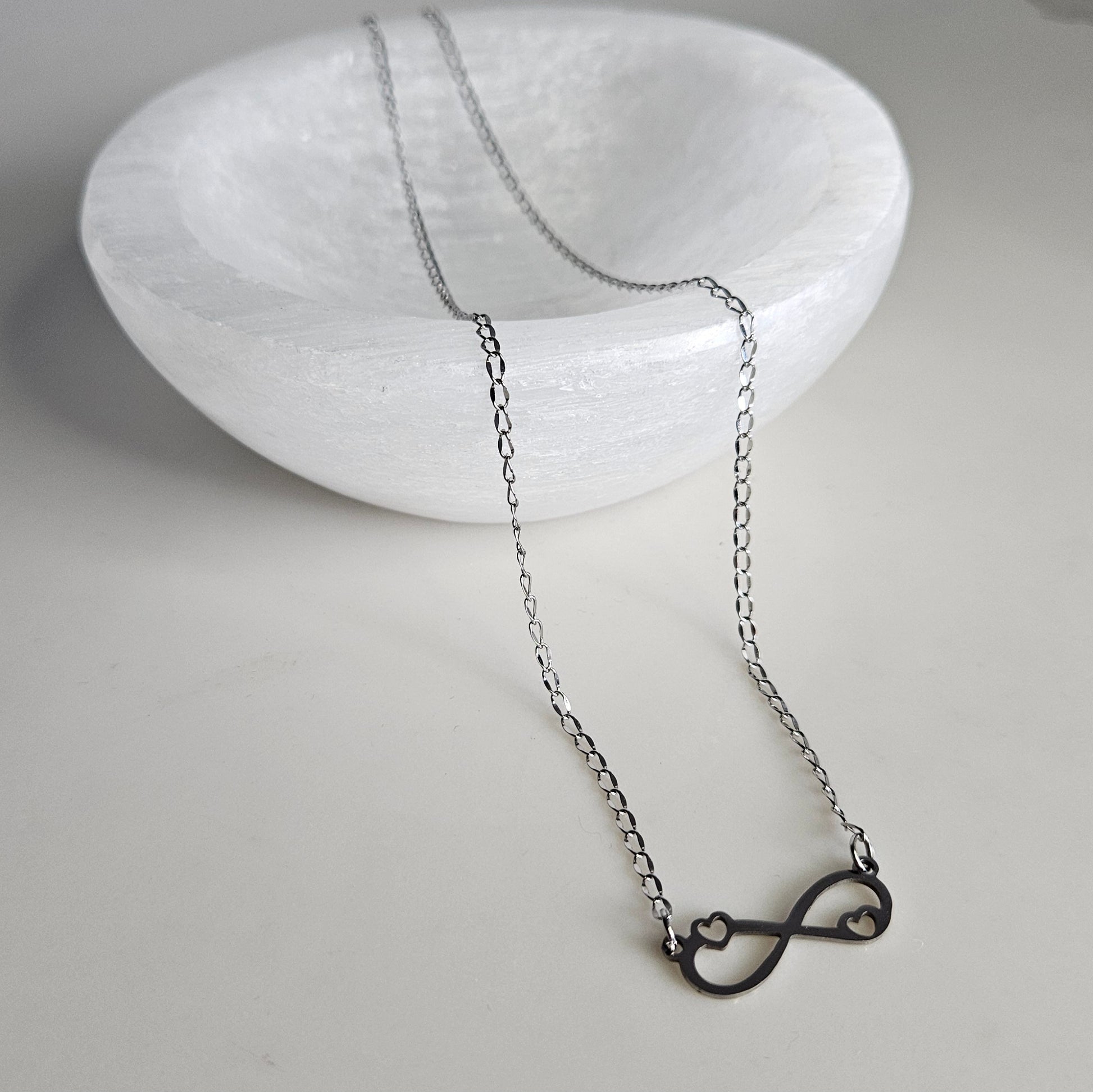 Un collier délicat et intemporel en acier inoxydable, orné d’un pendentif infini avec deux cœurs, symbole d’amour éternel et de lien indestructible. Léger, raffiné et résistant, il accompagne vos tenues au quotidien sans ternir ni s’abîmer.
