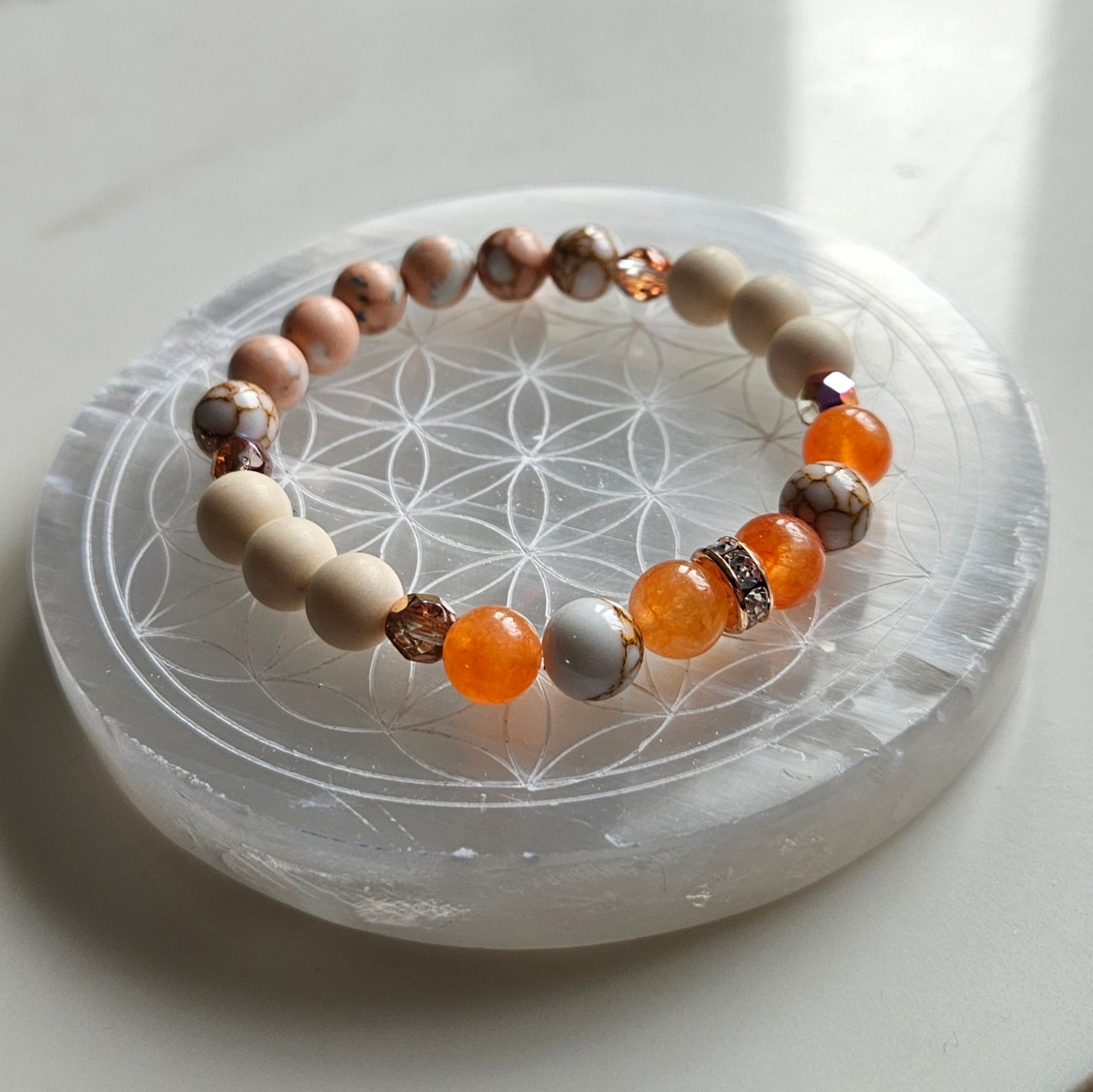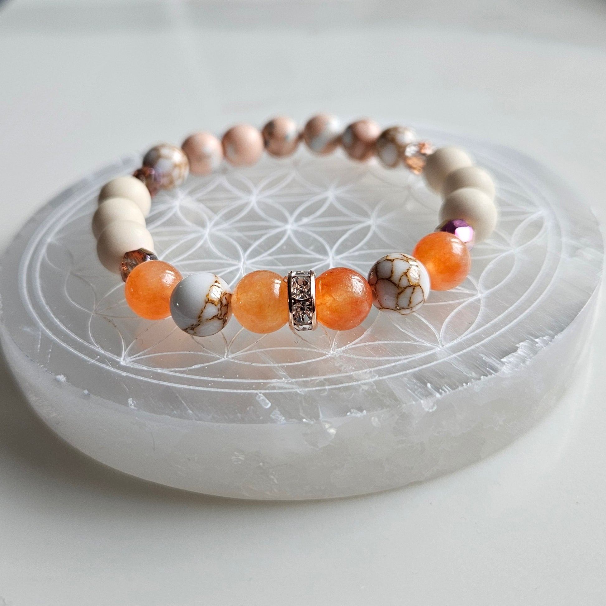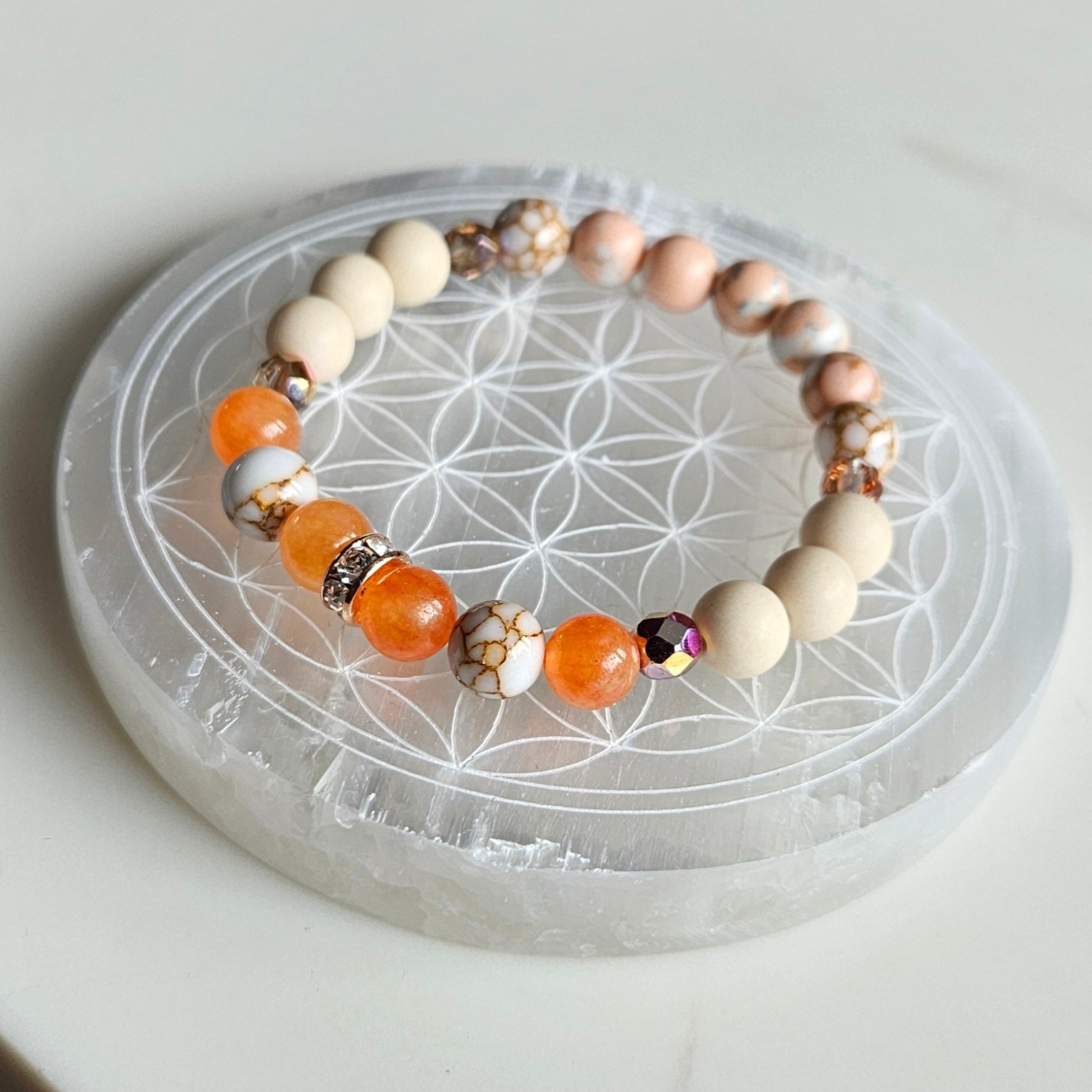 Ce bracelet au charme naturel marie la douceur du riverstone mat aux tons apaisants du jaspe rose et crème. Les perles de verre tchèque et les séparateurs dorés ajoutent une touche d'éclat et de lumière.