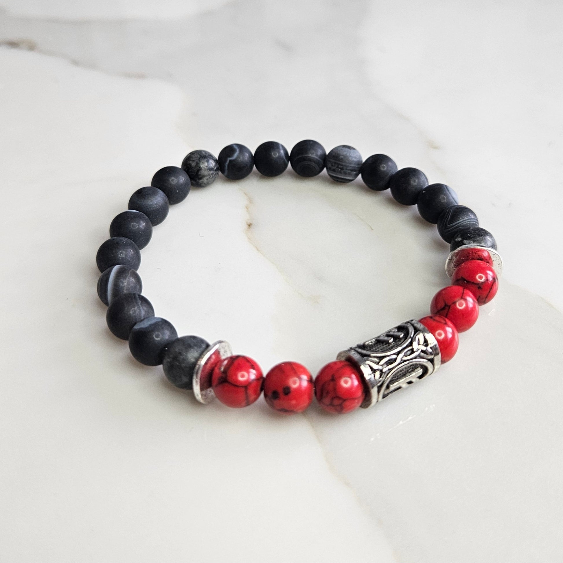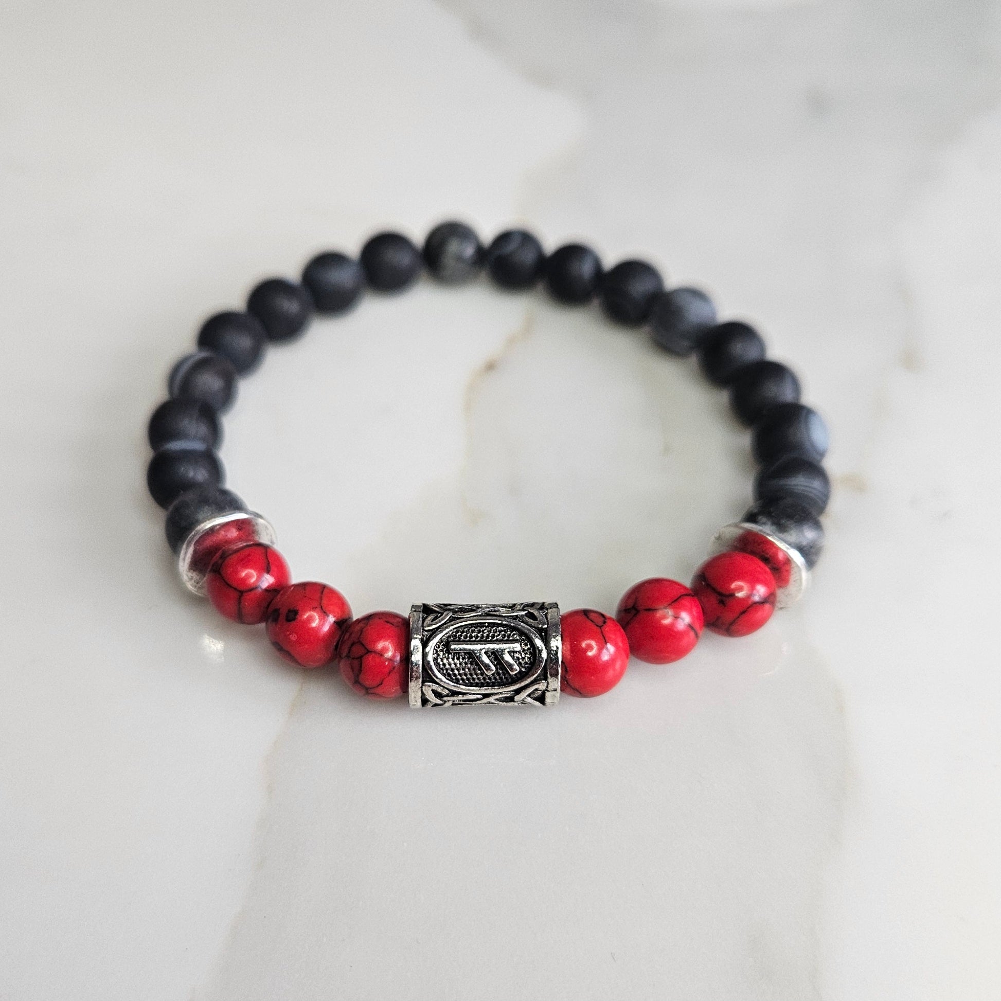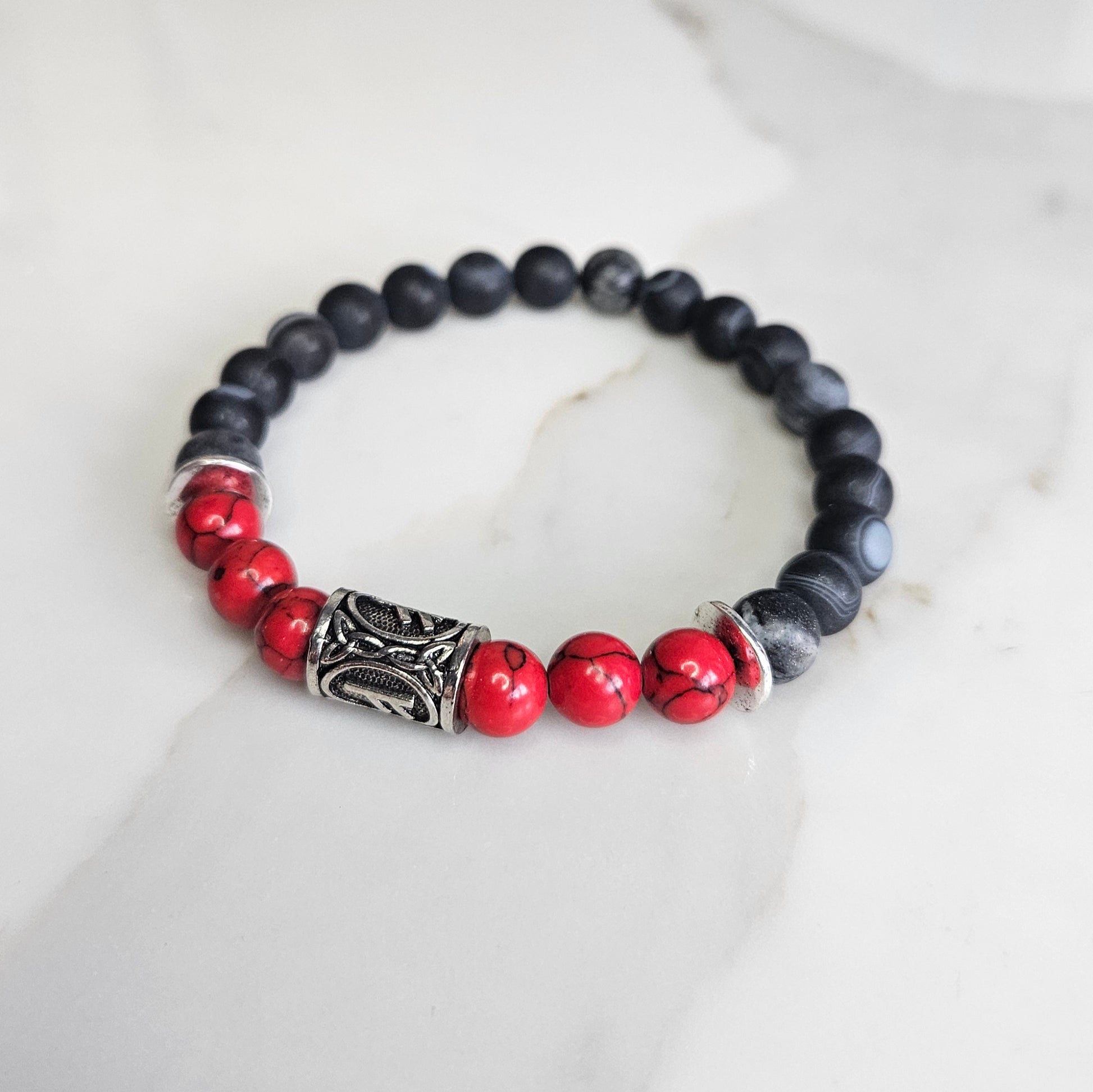 Bracelet puissant en howlite rouge et agate noire. Un tube central orné de runes renforce son caractère.