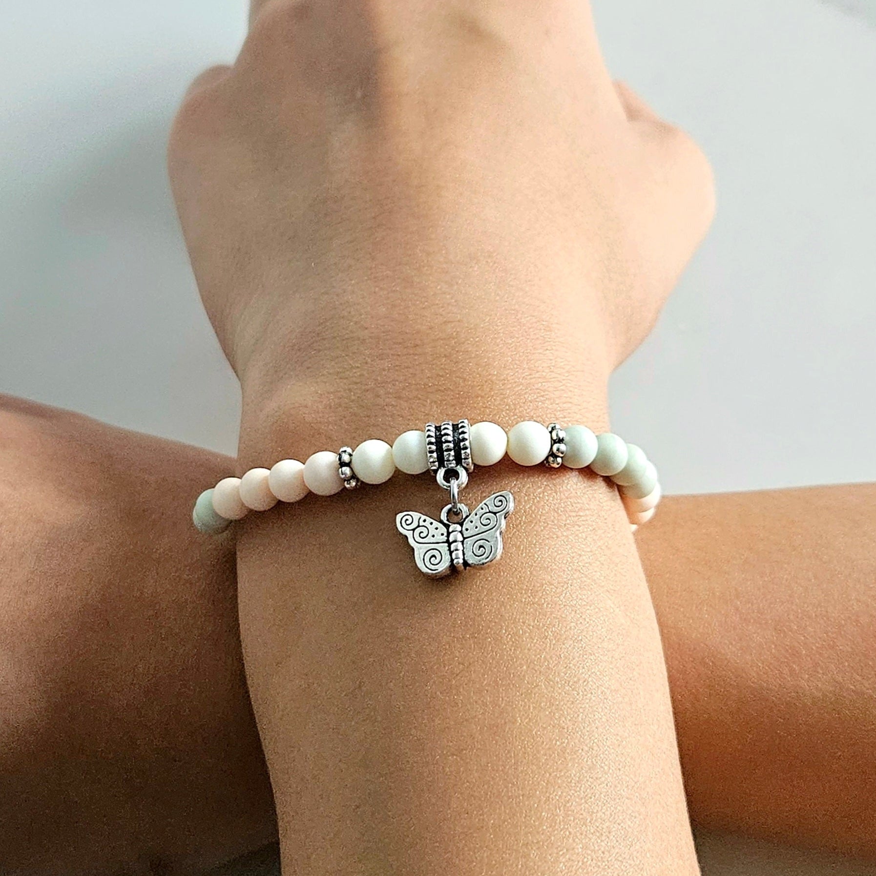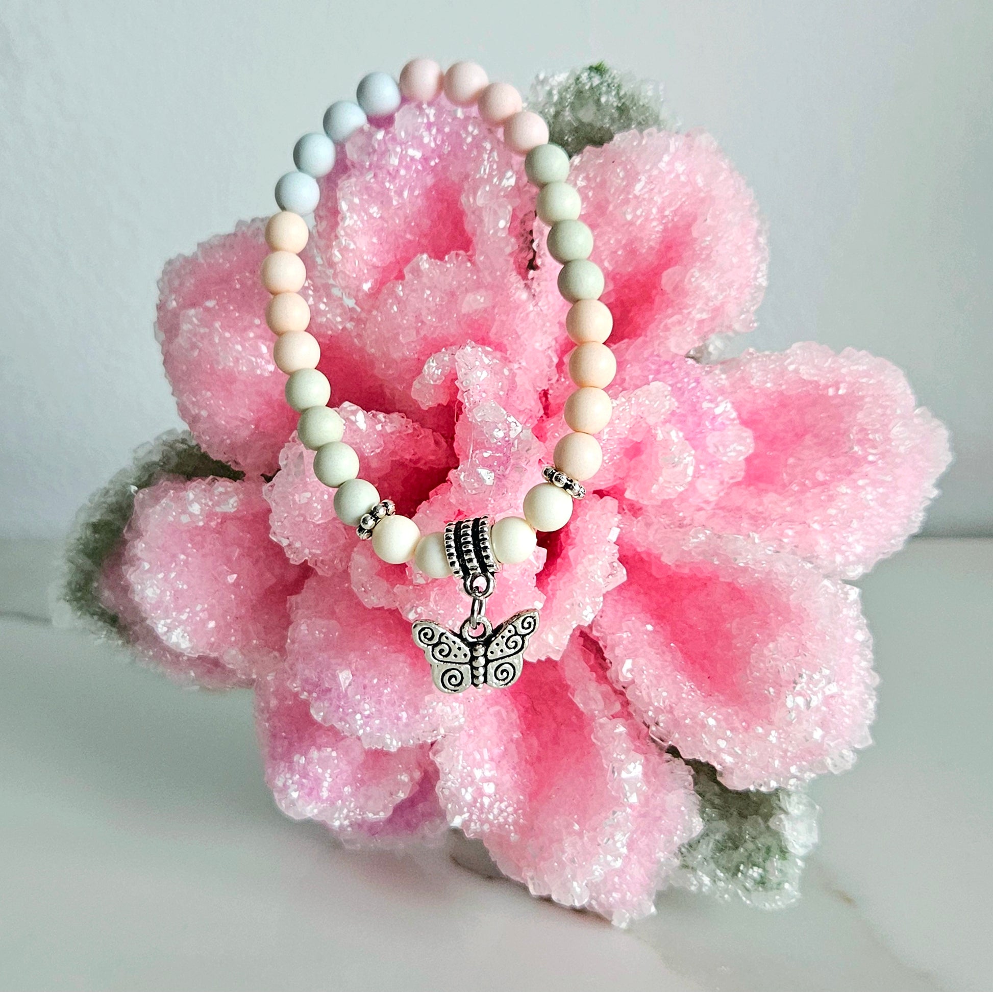 Ce bracelet pour enfant se compose de perles mates aux couleurs pastel douces, comme le blanc, le bleu clair, le rose et le gris. Un charmant papillon de couleur argentée pend d'une perle décorative.