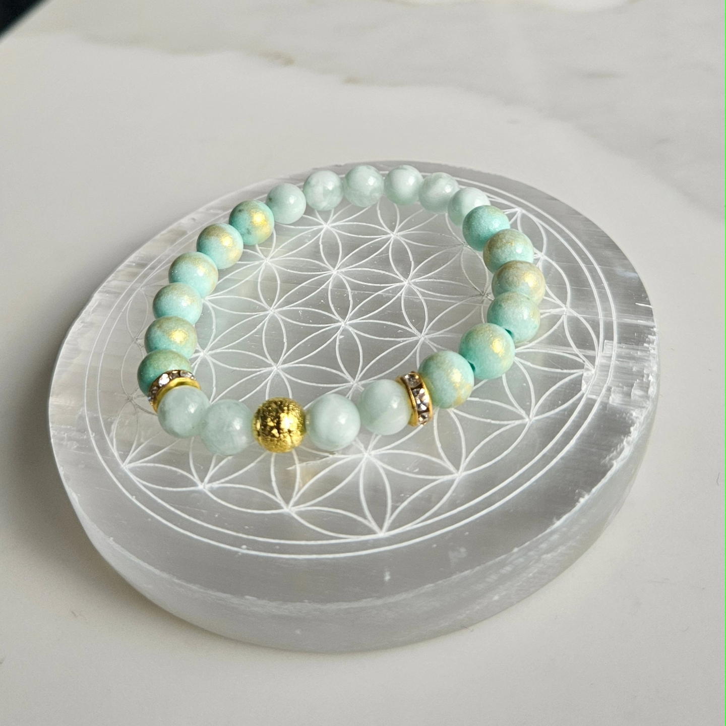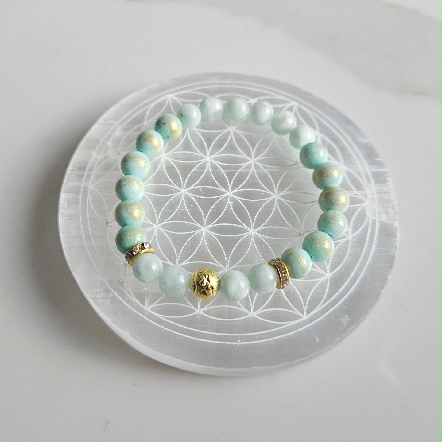 Ce bracelet allie les vertus d'harmonie du jade vert à la douceur apaisante du larimar, une pierre rare aux couleurs de la mer. Une perle dorée incrustée de cristaux apporte une touche de lumière et d'élégance.