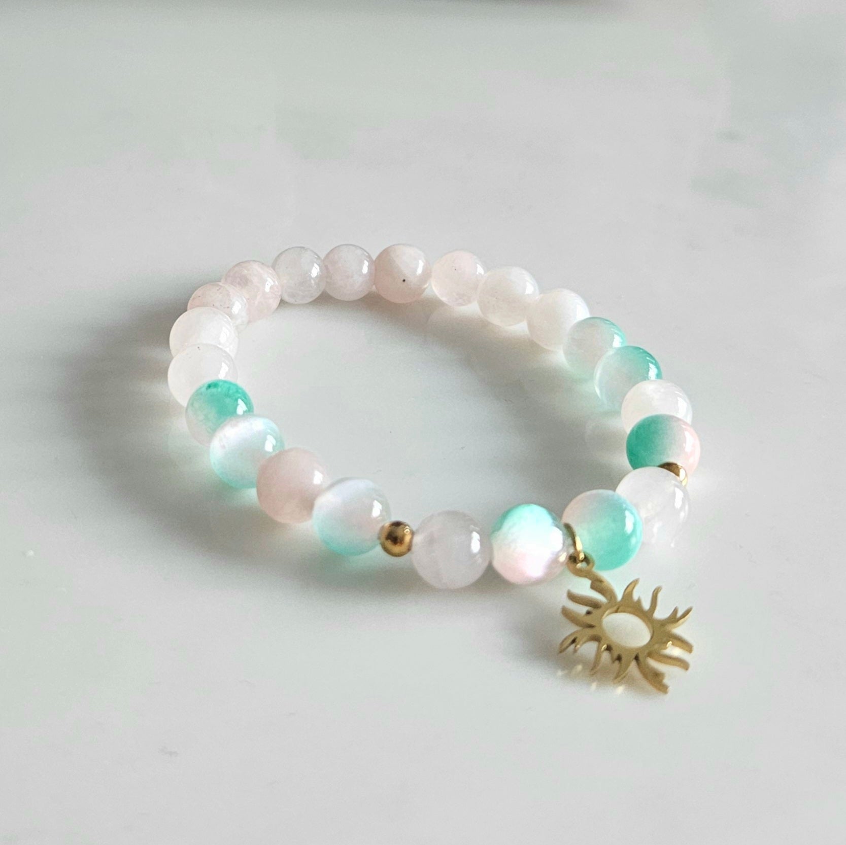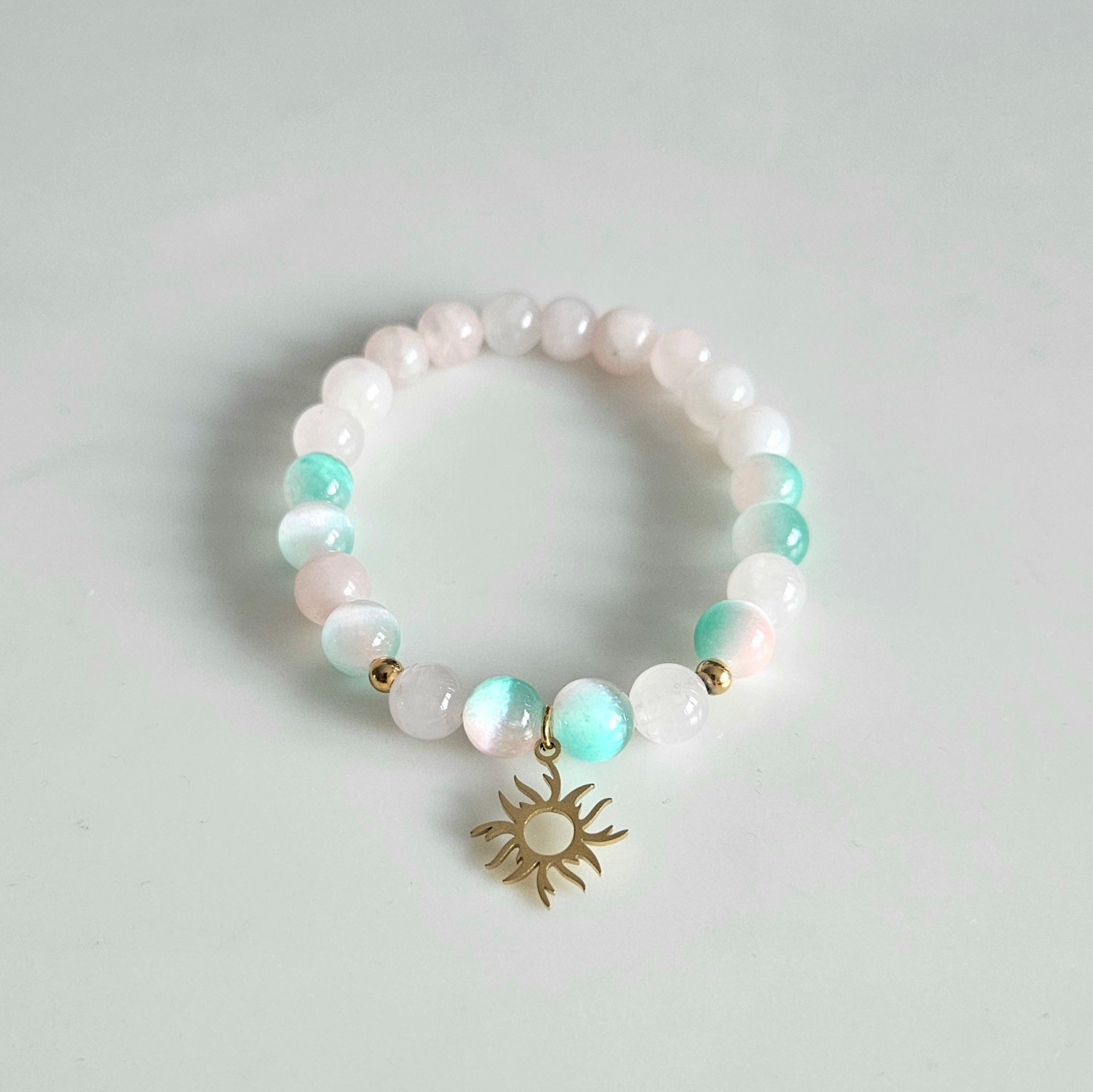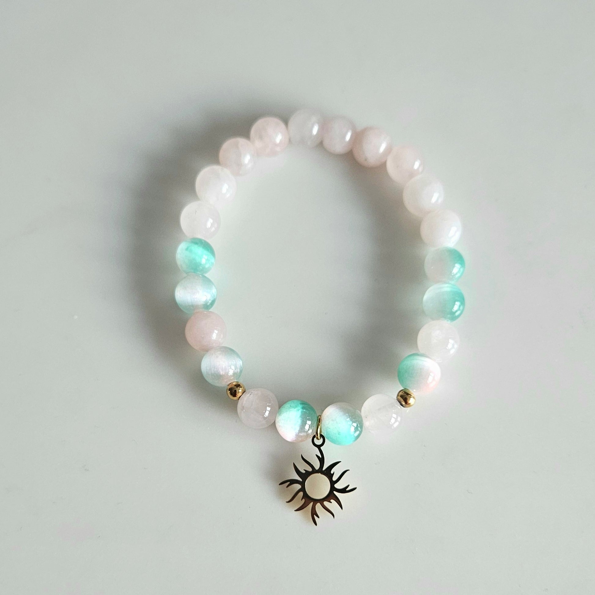 Élégant bracelet alliant la douceur du quartz rose et les reflets chatoyants de la sélénite aux tons teal. Un charmant soleil doré symbolise la joie et la lumière.