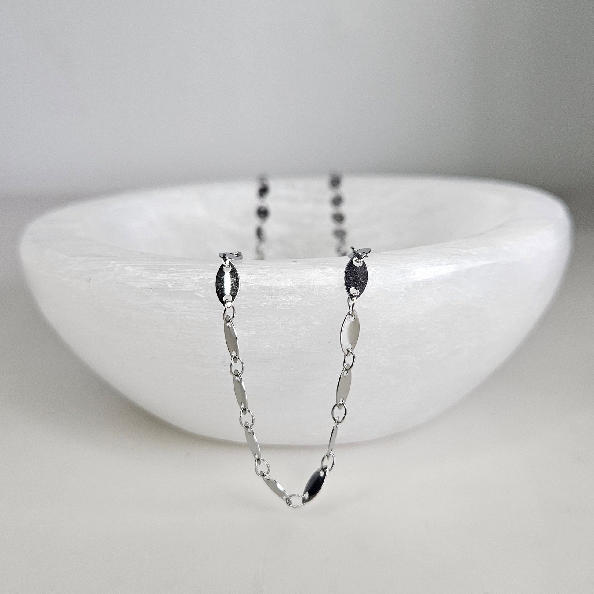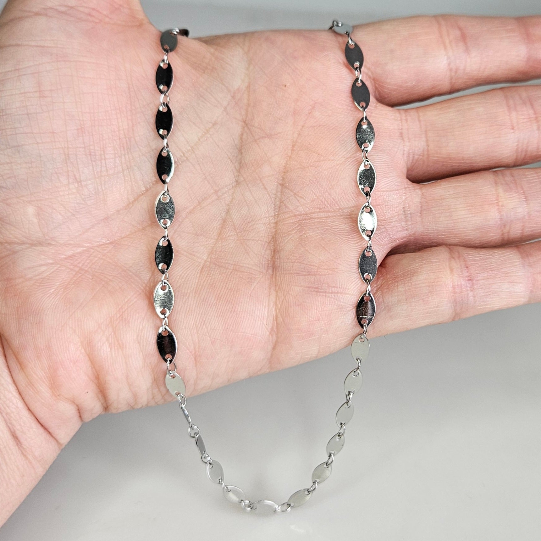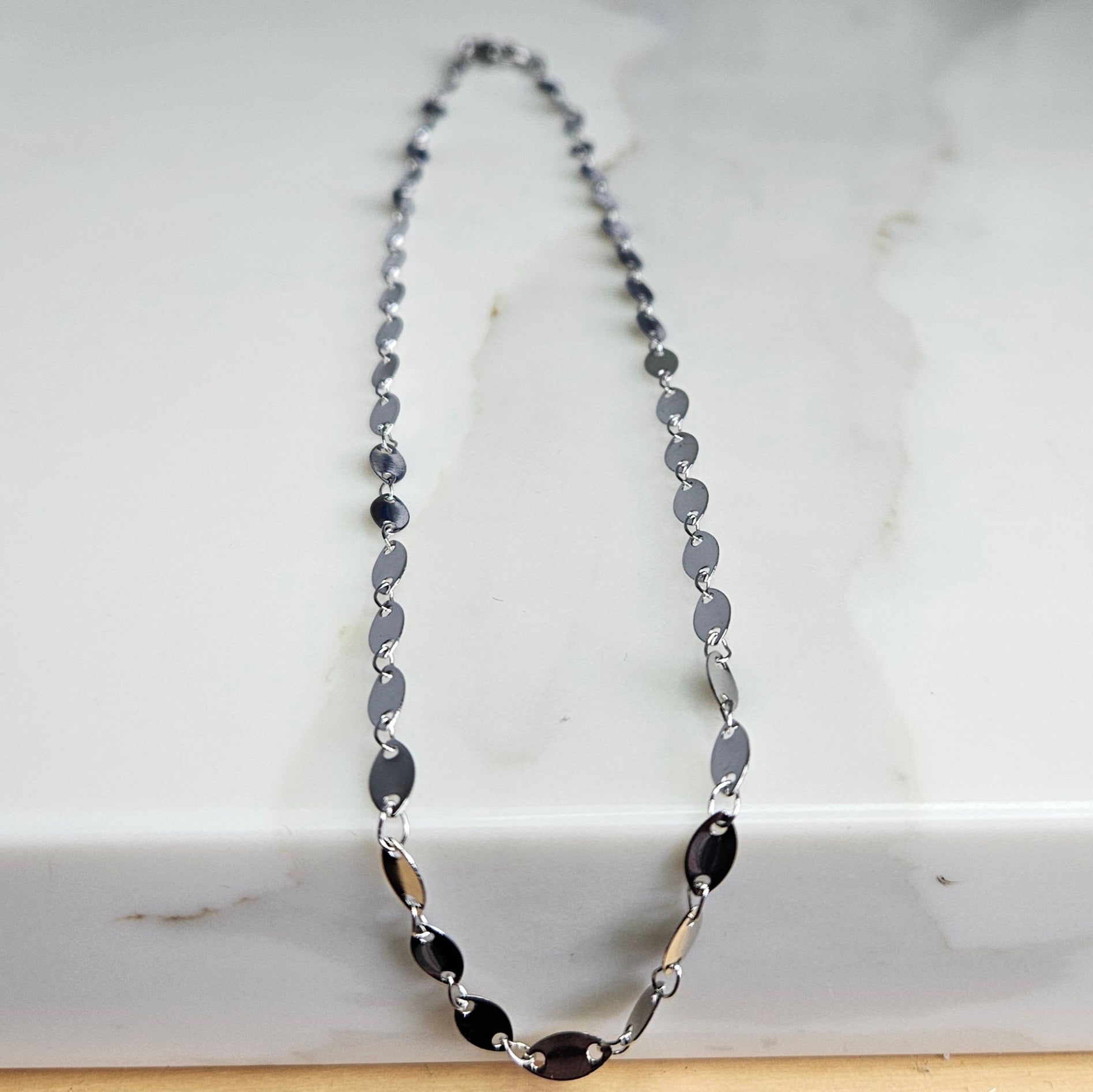 Ce choker tendance et délicat est composé de petits disques ovales en acier qui scintillent discrètement, captant la lumière à chaque mouvement.