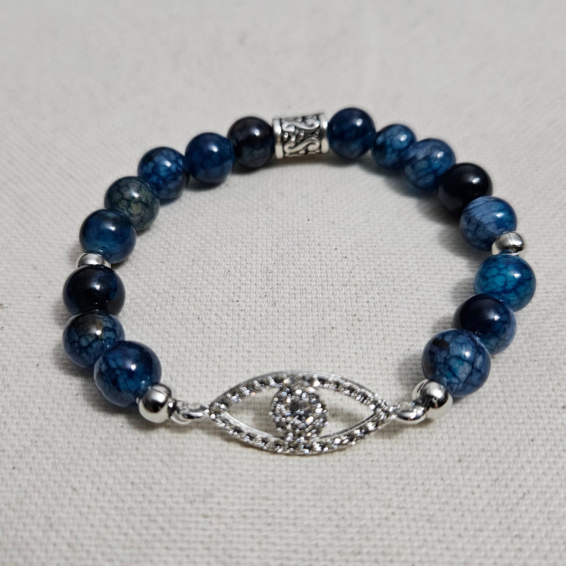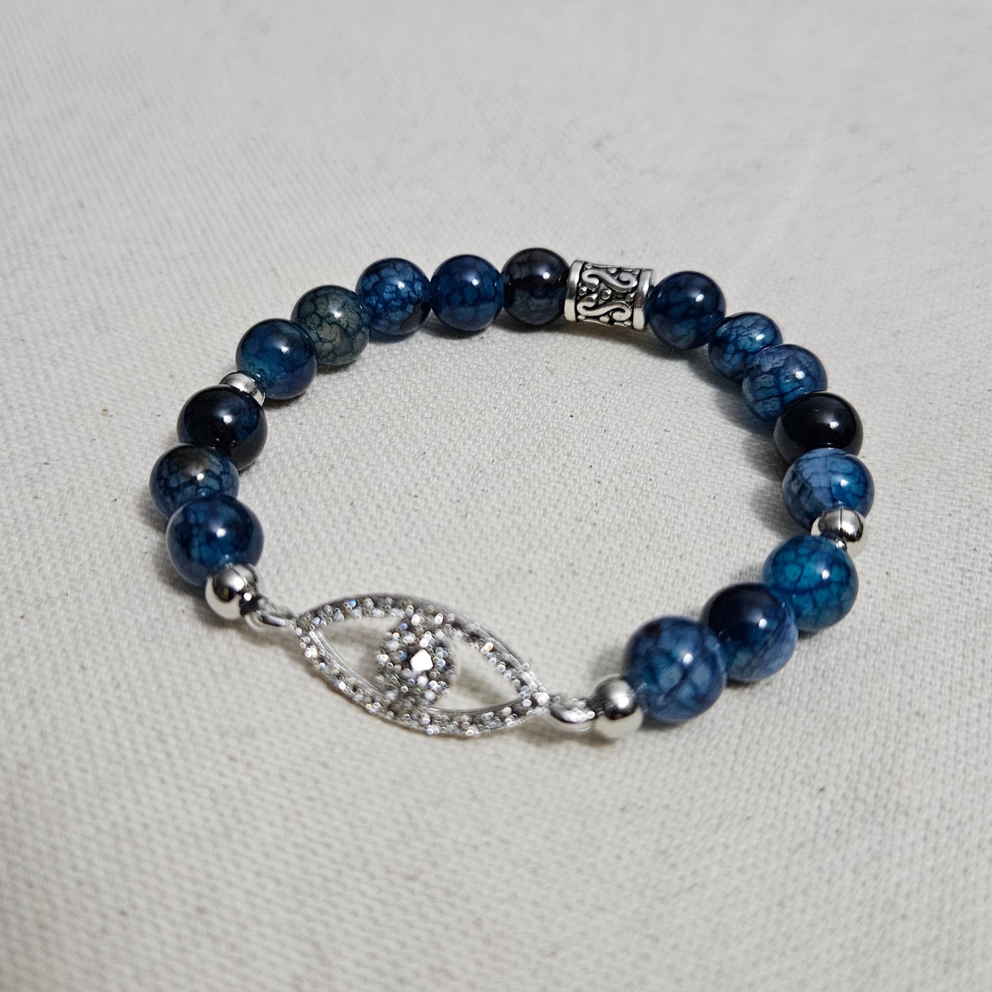 Ce bracelet combine les motifs uniques de l’agate bleue craquelée à un puissant talisman : l’œil protecteur. L’agate bleue apporte calme et sérénité, tandis que l’œil repousse les énergies négatives.
