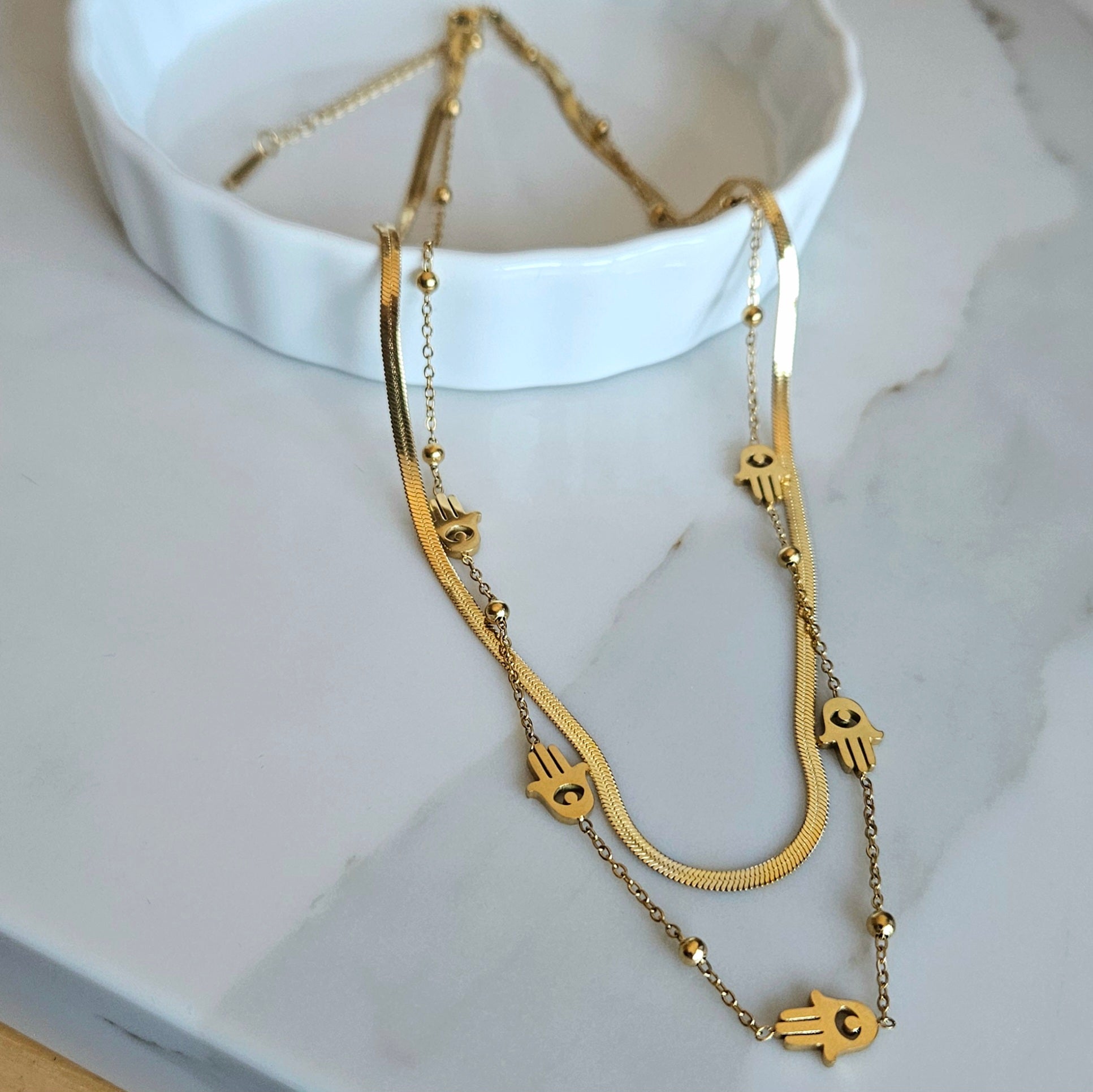 🧿 | Pièce Unique | Double Collier Mains de Fatma | Acier Inoxydable Doré | Longueur 40, cm + 5 cm rallonge