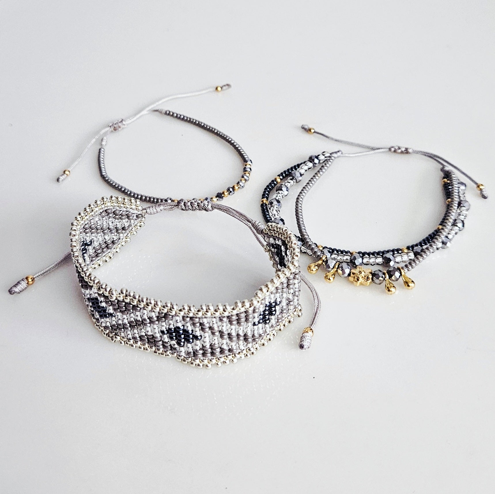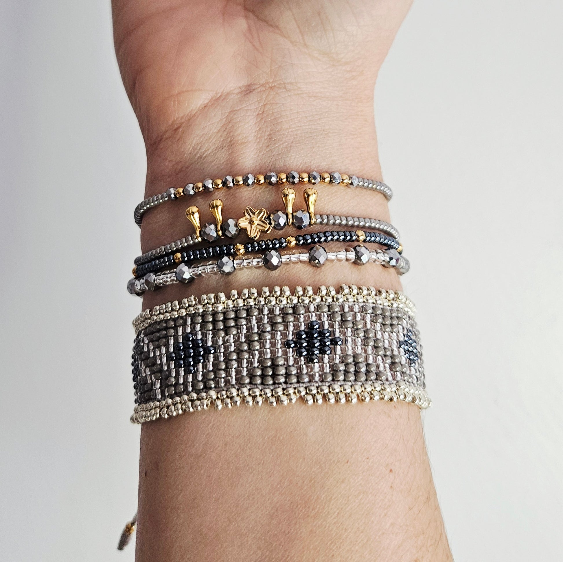 Le Stacking parfait, sans effort. Cet ensemble manchette et bracelets fins allie l'art du tissage Miyuki à l'élégance urbaine des tons gris et or.